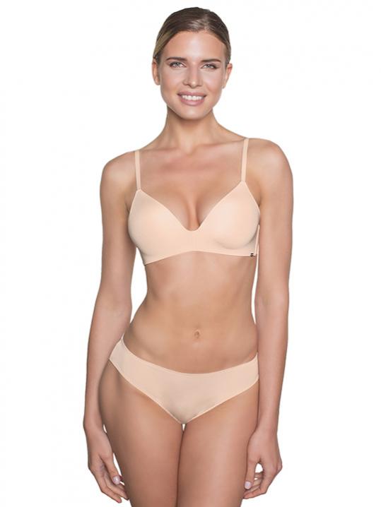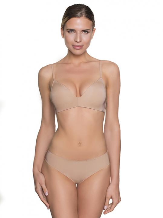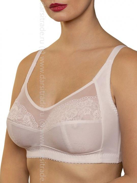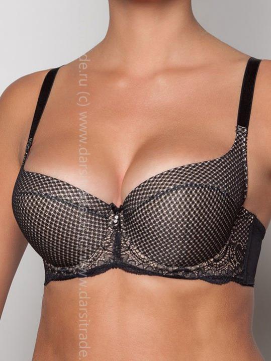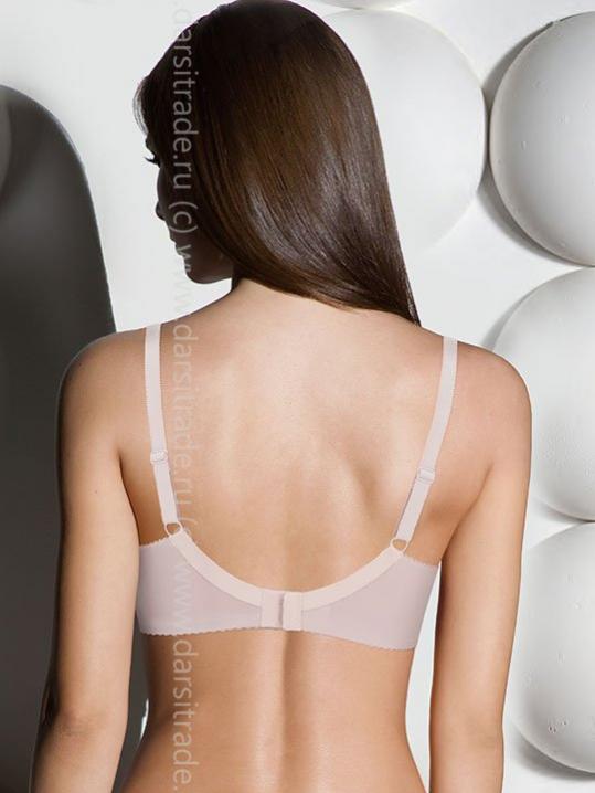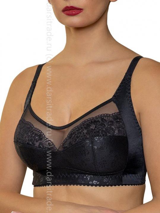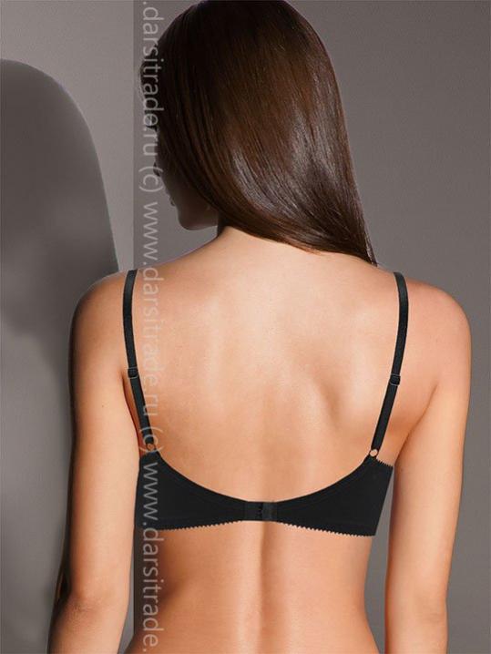 с подкроем без каркасов. Выполнен из трикотажного набивного полотна и эластичного кружева. Боковой подкрой, переходящий в бретель, сдвигает грудь к центру и помогает создать округлую форму. Верхняя деталь чашки выполнена из эластичного кружева и сетки, по верхнему краю чашки проходит вшитая тоненькая резинка, благодаря которой, чашка идеально прилегает к телу. На спине застежка, количество крючков в ряду застёжки увеличивается пропорционально размеру бюстгальтера, от 2 до 3 крючков.