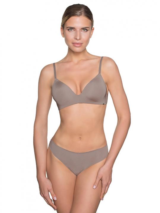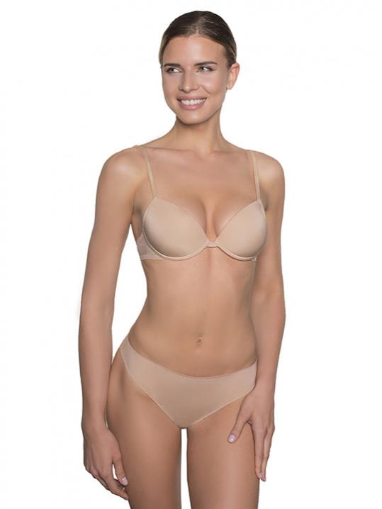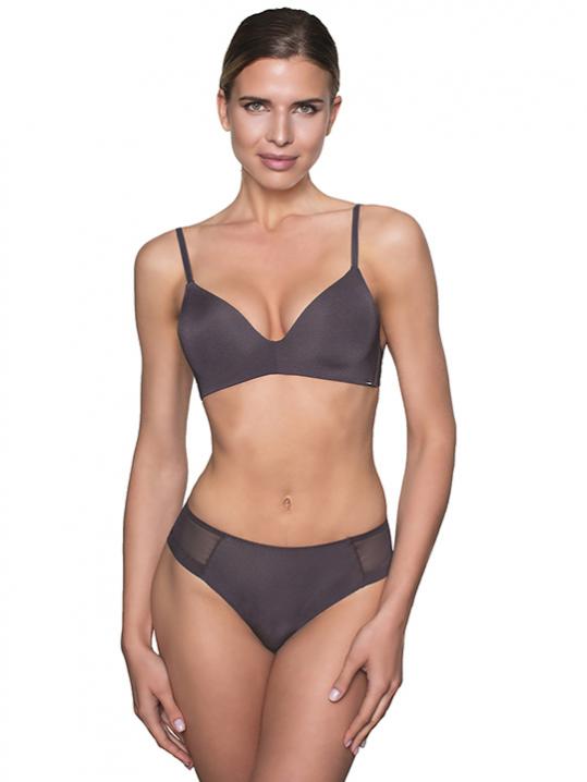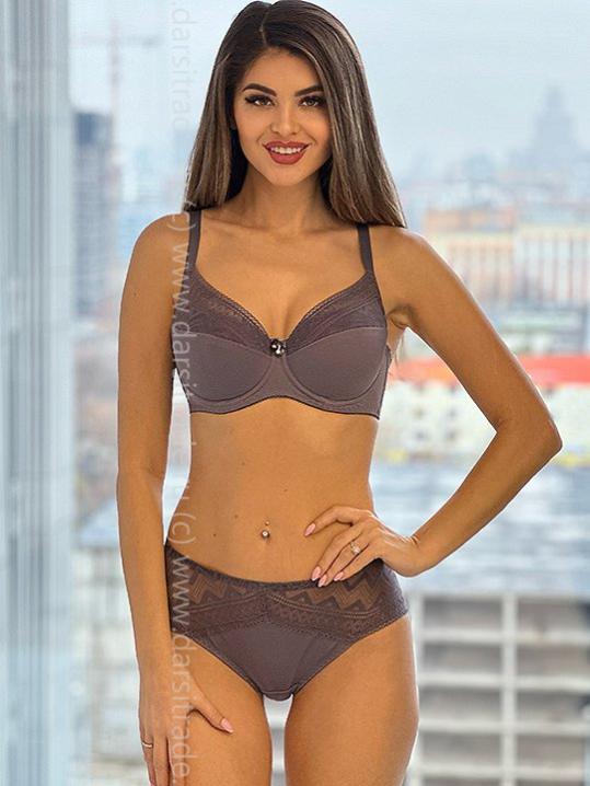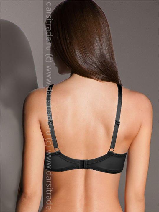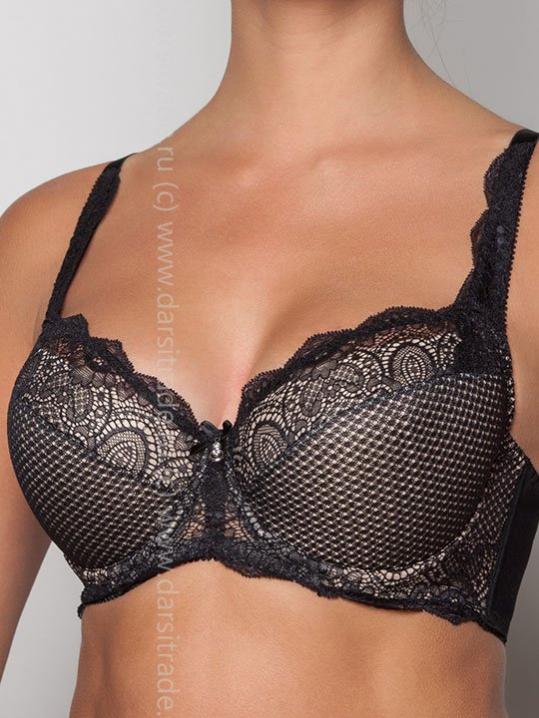 с средне-градуированной чашкой Navara (со средним эффектом пуш-ап) и трусики-бразильяна со средней высотой посадки, резинка на талии спереди по верху тканей. Бюст дублирован спереди по стану хлопком, с боковыми костями. Отстегивающиеся бретели, декорированные кружевом сзади, дополнительный комплект простых, черных бретелей, возможно ношение без бретелей. Застежка в 2 ряда на 3 позиции. Выполнен из сетки и кружева. Высота бока трусов 6,5 см. Коллекция "