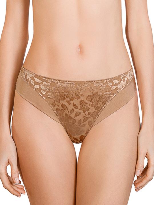 Трусы-слип (панти) со средней линией талии. Выполнены из жаккардового набивного полотна с цветочным арнаментом и эластичного кружева. Срезы по краю ножек обработаны на плоскошовной машине. Украшение: атласный бантик.