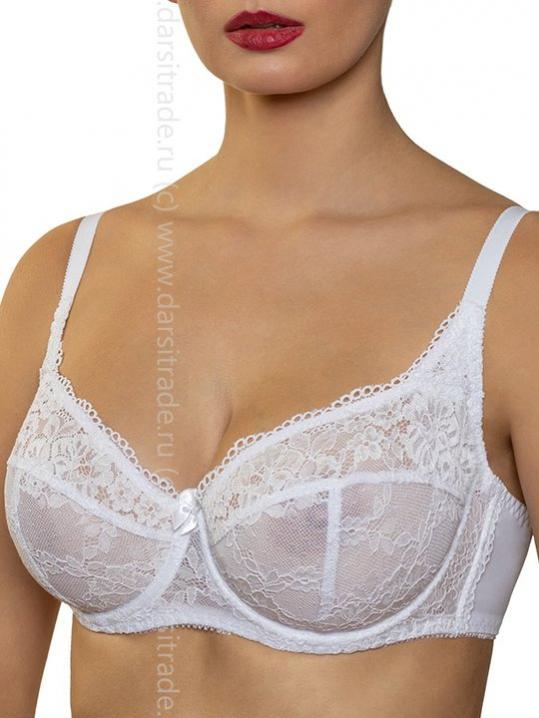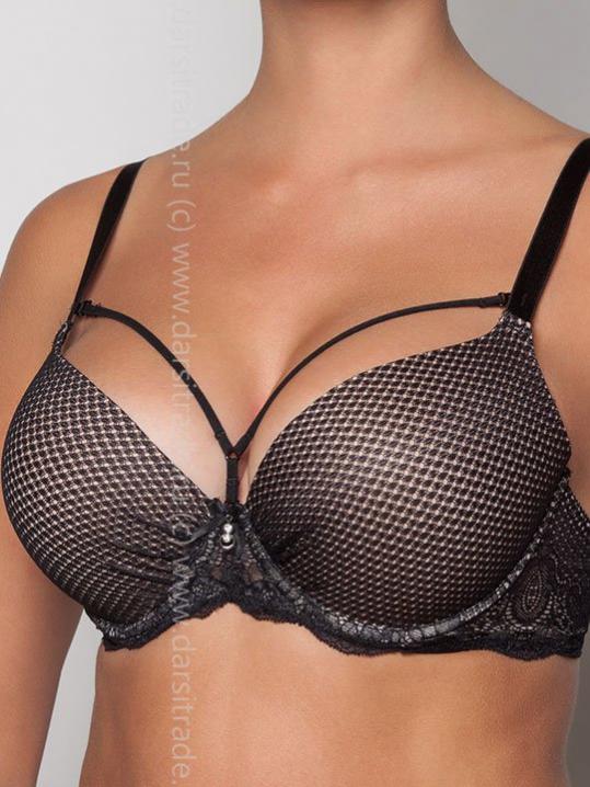 с формованными чашками с гелевыми подушками. Выполнен из тончайшего немецкого эластичного кружева, декорирован стрепами. Формованные чашки с гелем визуально увеличивают грудь, формирует шикарную линию декольте. Съемные бретели. Украшение: атласный бантик подвеской.