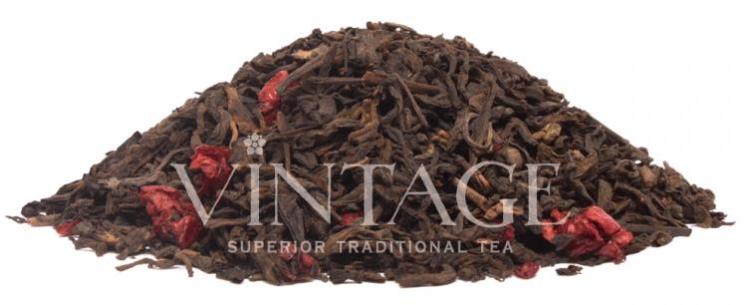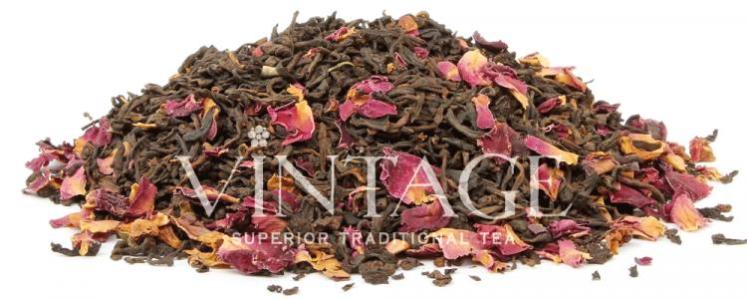 китайский черный чай пуэр, клубника ягоды, капли белого шоколада, лепестки роз.