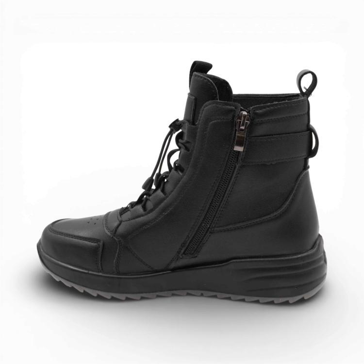 Материал: натуральная кожа высокого качества, которая обеспечивает долговечность, устойчивость к влаге и комфорт.Комфорт: мягкая стелька с амортизацией и удобная колодка обеспечивают поддержку стопы даже при длительной носке.Защита от влаги: влагоотталкивающая пропитка и прочная подошва защищают от дождя и слякоти.Дышащий дизайн: натуральная кожа обеспечивает вентиляцию, предотвращая перегрев и сохраняя комфорт.Дизайн: стильный дизайн со шнуровкой и молнией добавляет ботинкам уникальный вид, позволяя легко сочетать их с различными образами.Подошва: прочная резиновая подошва с противоскользящим эффектом обеспечивает устойчивость на мокрых поверхностях.Модель на любой взъ