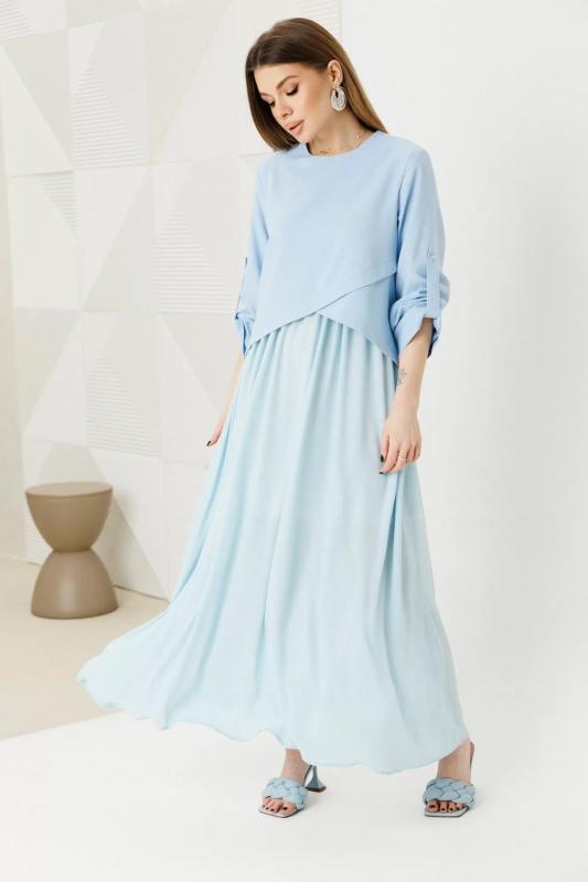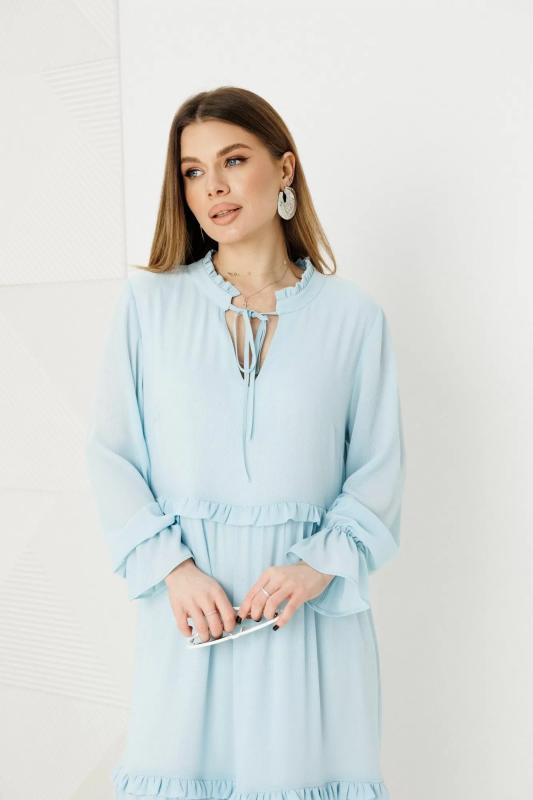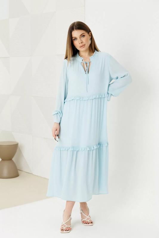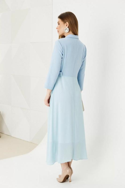 Платье женское полуприлегающего силуэта из двух видов ткани из мягкого трикотажа и струящегося шифона. Лиф платья выполнен из трикотажа, вырез горловины V-образный, по полочке обработаны рельефы, по спинке талиевые выточки. Юбка платья выполнена из шифона которая по верху присборена, благодаря чему юбка элегантно струится на фигуре, в среднем шве юбки по полочке обработан разрез. Лиф платья по полочке задекорирован четырьмя акцентными пуговицами. Платье дополнено отлетным поясом из основной ткани застёгивающимся на пряжку протяжку.