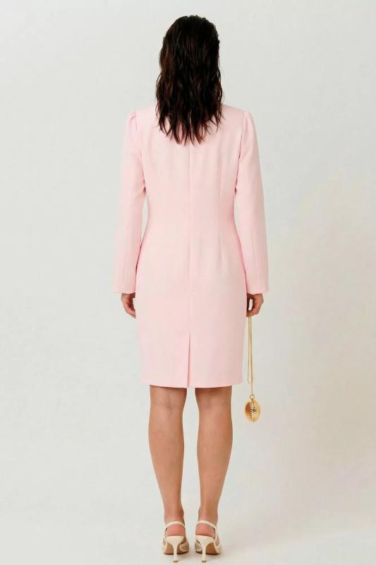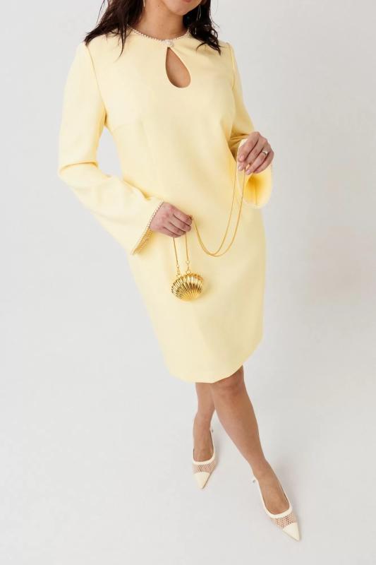 Элегантное платье-футляр, выполненное из плотной плательной ткани на подкладке. Дизайн акцентирован декоративной бейкой с жемчужным оформлением на горловине и манжетах рукавов — технически точная обработка краев, обеспечивающая долговечность и эстетику. Центральная деталь — пуговица-застежка на горловине, формирующая изысканный вырез-капель с эффектом глубины. Конструктивные особенности: Прямой крой с приталенным силуэтом подчеркивает фигуру, сохраняя строгую линию. Спинка выполнена без декоративных элементов (простая конструкция, соответствующая стандартам швейного производства). Идеально для официальных мероприятий, деловых встреч и вечерних образов. Сочетает классические элементы костюмной моды с современными деталями, характерными для трендов 2026 года.