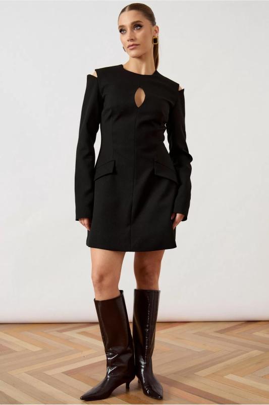Платье женское приталенного силуэта длины мини, выполнено из плотной костюмной ткани черного цвета. Изделие с круглым вырезом горловины и акцентным вырезом в форме «капли» по центру полочки. Конструктивной особенностью модели являются открытые плечи с фигурными вырезами, переходящими в длинный втачной рукав. Переднее полотнище платья со средним швом и талиевыми вытачками для идеальной посадки по фигуре. На уровне бедер расположены декоративные клапаны. Спинка с талиевыми вытачками и застежкой на потайную молнию. Линия низа изделия ровная, обработана в подгибку.