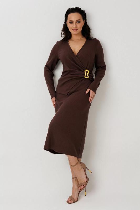 Трикотажное платье-запах с твист-деталью и декоративной застежкой Изготовлено из эластичного трикотажного полотна с выраженной структурой, обеспечивающего комфорт и облегающий силуэт. Дизайн включает глубокий V-образный вырез, рукава длиной до запястья. Центральная твист-деталь (скрученная конструкция) зафиксирована декоративной металлической застежкой, подчеркивающей женственность и акцентирующей талию. Длина миди гармонично подчеркивает фигуру. Особенности: Спинка выполнена без дополнительных декоративных элементов (простая конструкция, соответствующая стандартам швейного производства). Материал сохраняет форму, не вытягивается, обеспечивает драпируемость и легкость в уходе. Идеально для создания элегантного образа в офисе или на вечернем мероприятии. Сочетает функциональность конструкции запаха с современными деталями, характерными для трендов 2026 года.