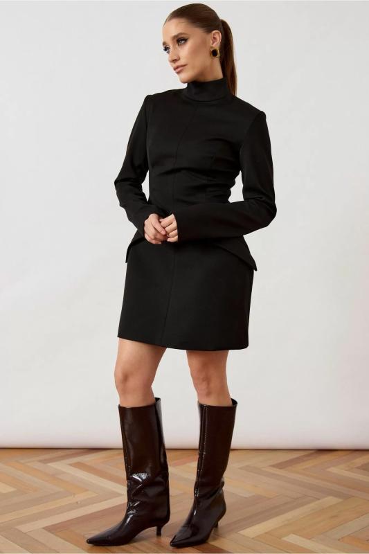 Платье женское приталенного силуэта длины мини, выполнено из плотной костюмной ткани черного цвета. Изделие с воротником-стойкой и длинным втачным рукавом. Переднее полотнище платья с вертикальным средним швом и талиевыми вытачками, обеспечивающими плотное прилегание по фигуре. На уровне бедер расположены декоративные клапаны, имитирующие прорезные карманы. Спинка с талиевыми вытачками и застежкой на потайную молнию в среднем шве. Нижний край изделия обработан подгибкой, линия низа ровная.