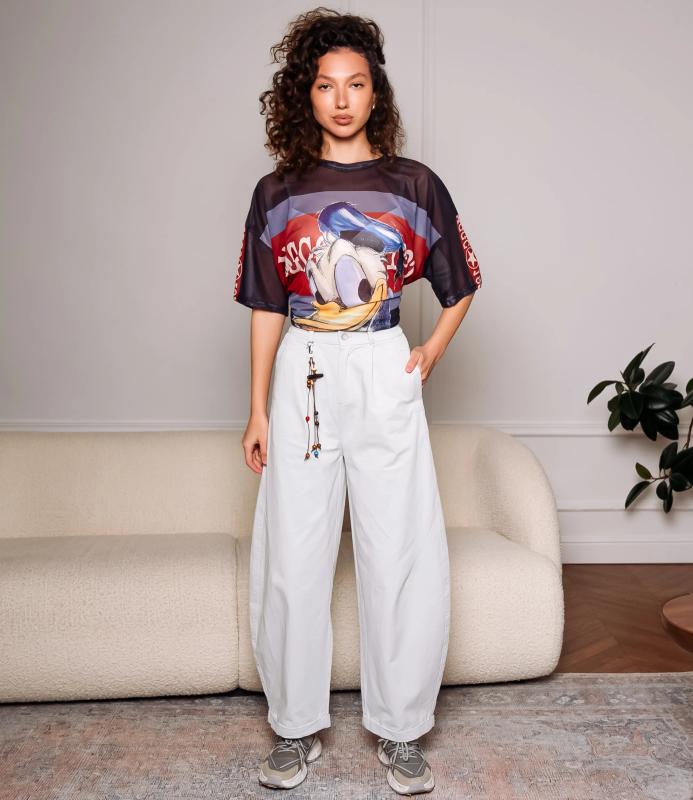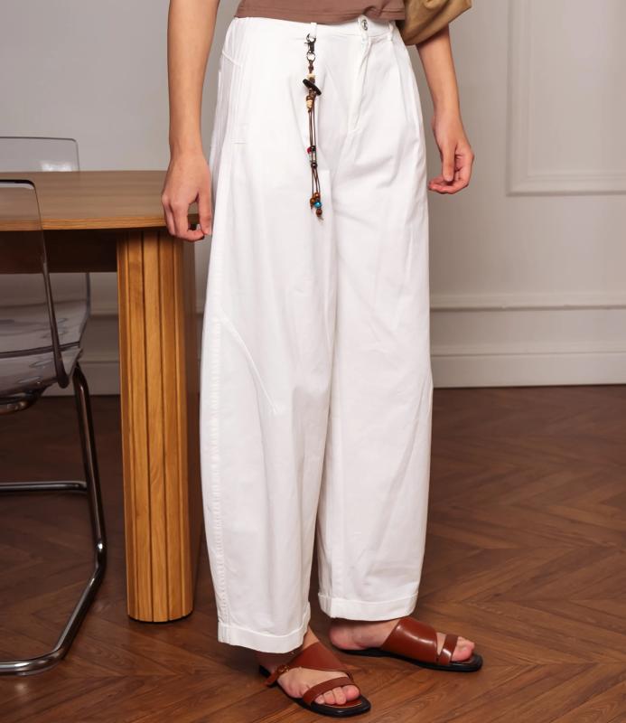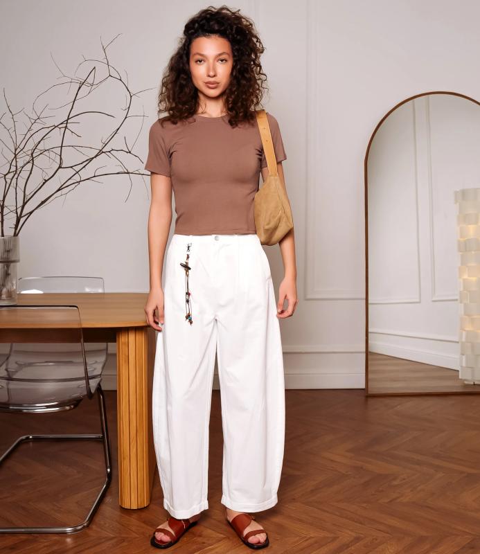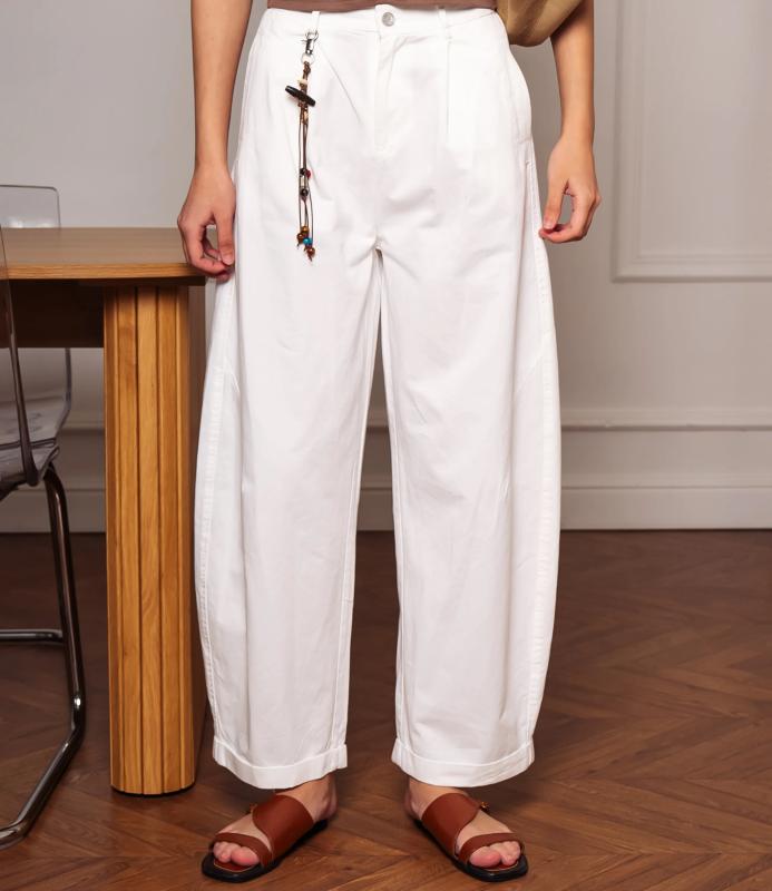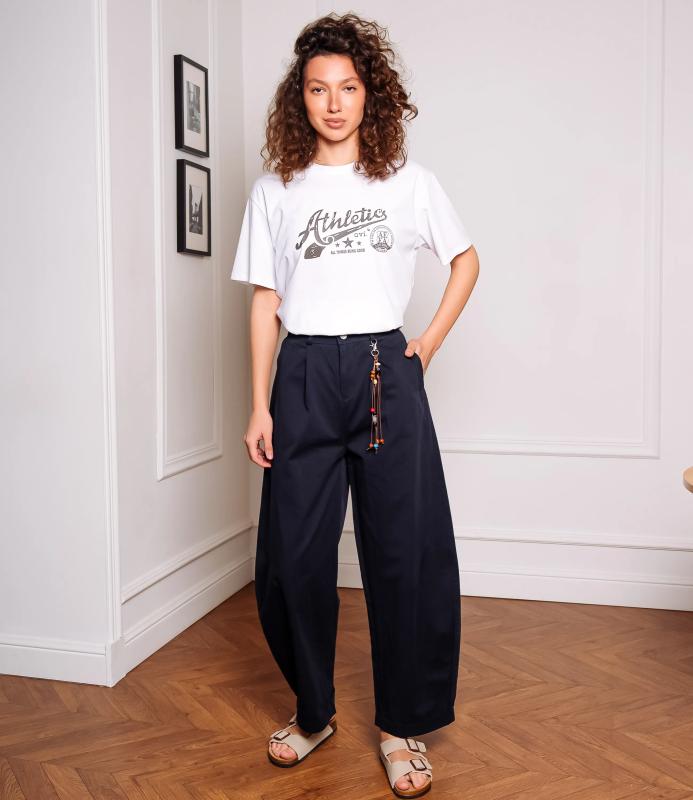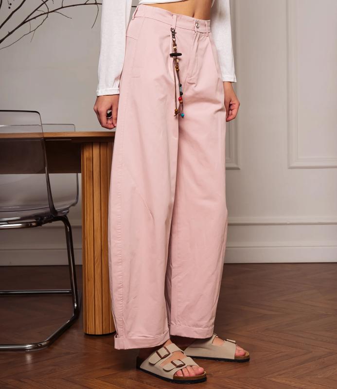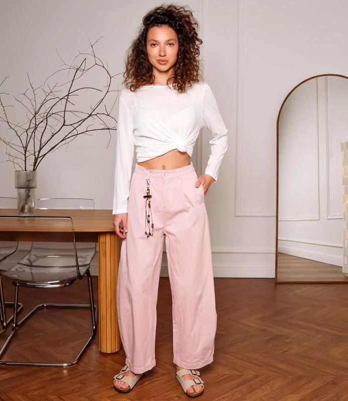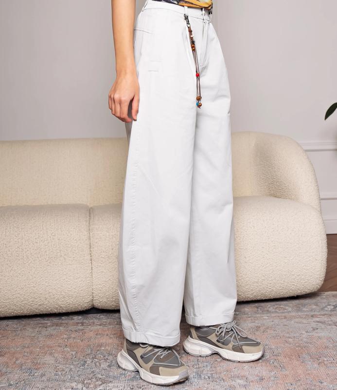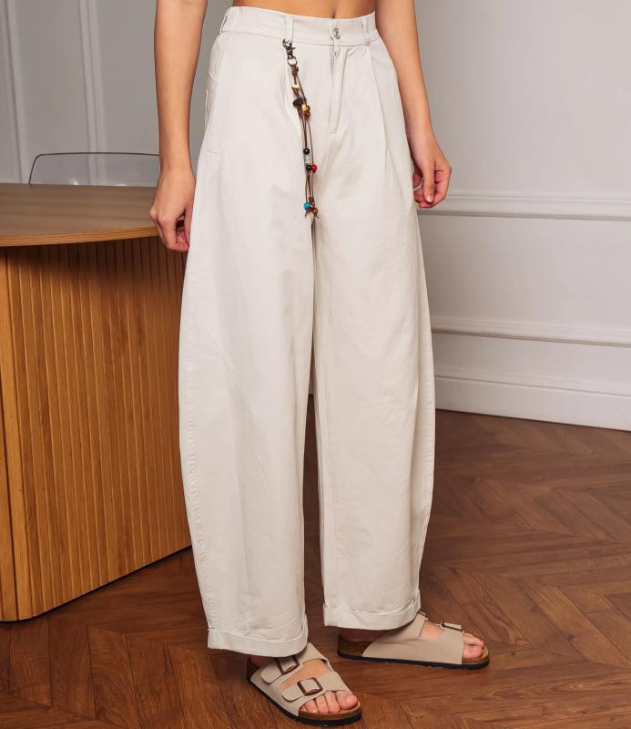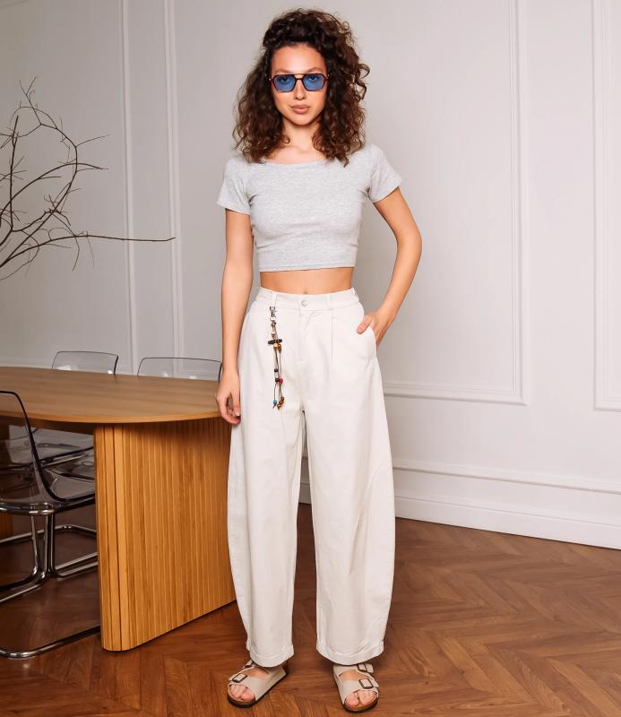 Брюки — это одежда, которая подчеркивает привлекательность любой женщины. Брюки свободного кроя с высокой посадкой. Обладают широким силуэтом, плавно сужающимся к низу, с мягкими складками в области бёдер, придающими объём и расслабленность образу. Пояс оснащён декоративной цепочкой с подвесками, которая добавляет стильный акцент и подчёркивает линию талии. Для пошива использована ткань из 65% хлопок и 35% полиэстер, которая характеризуется отменным качеством. Даже после многократных стирок изделие не утратит первоначальной привлекательности. Вы сможете предлагать их своим покупателям с радостью. Обратите внимание на цвет: он насыщенный и полностью соответствует фотографии на сайте. Чтобы вы были уверены в размере, мы представили на странице таблицу размеров. Воспользовавшись ею, вы сможете