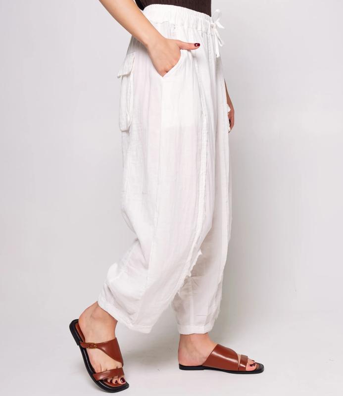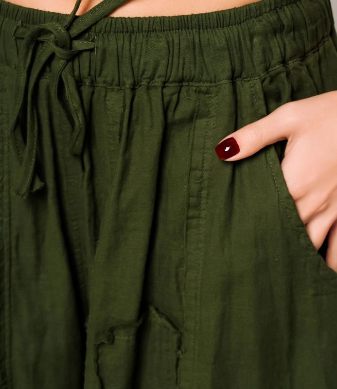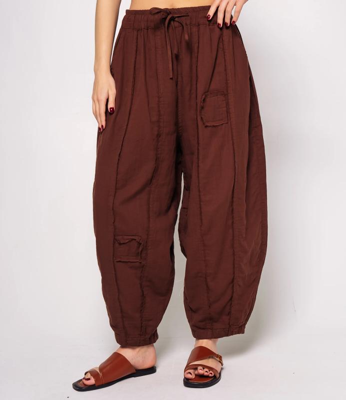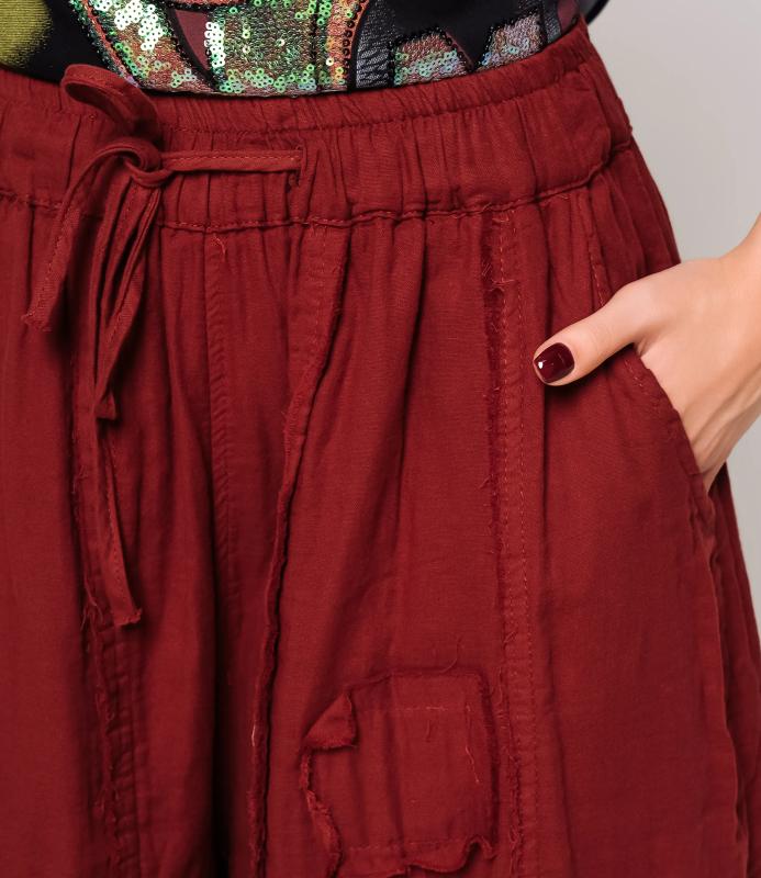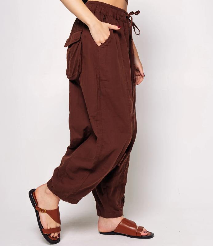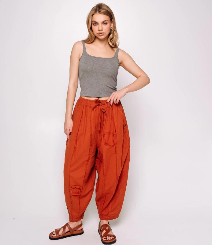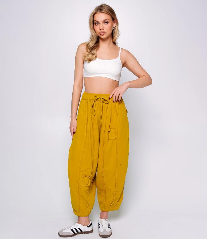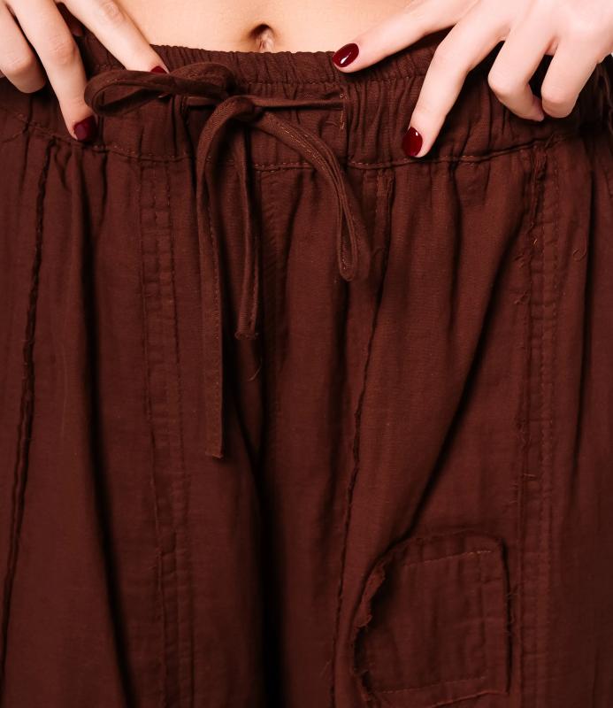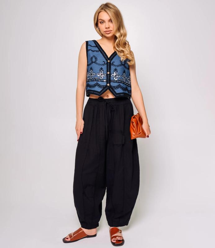 Брюки — это одежда, которая подчеркивает привлекательность любой женщины. Брюки свободного кроя из лёгкой мятой ткани. Эластичный пояс с завязками, широкие штанины с манжетами. Декоративные накладные карманы квадратной формы на бедре и колене. Вертикальные швы по длине. Мягкий материал, не сковывающий движения. Стиль — кэжуал с этническими мотивами. Для пошива использована ткань из 100% хлопок, которая характеризуется отменным качеством. Даже после многократных стирок изделие не утратит первоначальной привлекательности. Вы сможете предлагать их своим покупателям с радостью. Обратите внимание на цвет: он насыщенный и полностью соответствует фотографии на сайте. Чтобы вы были уверены в размере, мы представили на странице таблицу размеров. Воспользовавшись ею, вы сможете сами обмерить себя и удостовериться