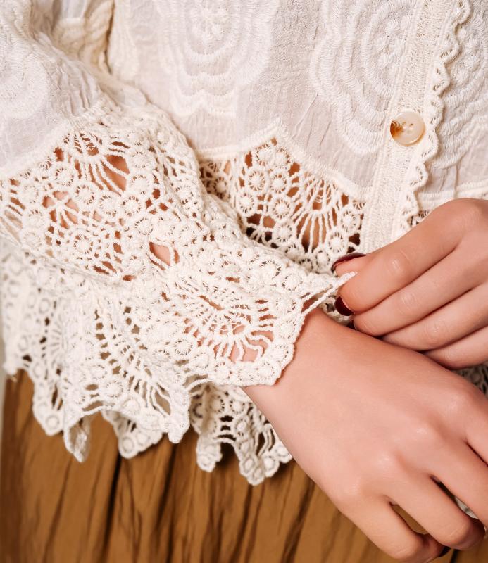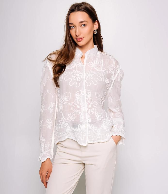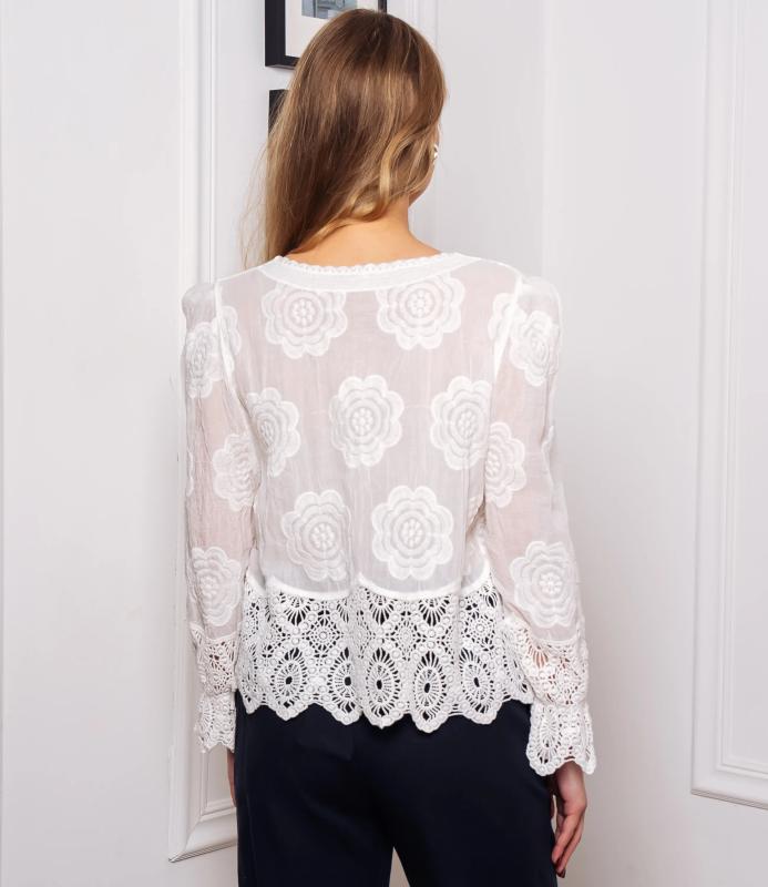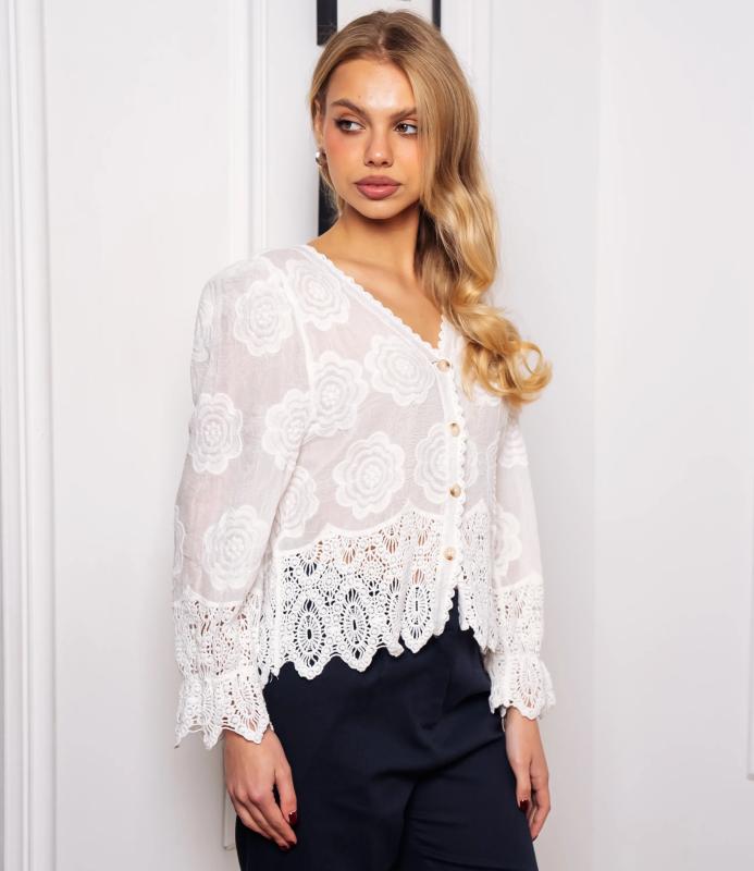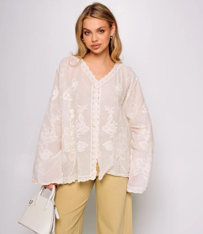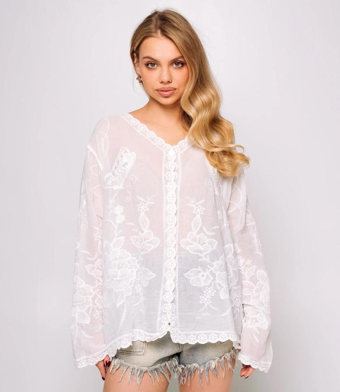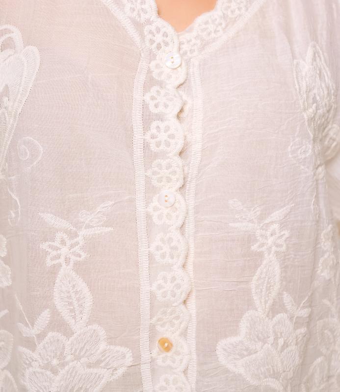 Блуза — это часть гардероба, которая подчёркивает привлекательность и индивидуальность любой женщины. Тонкая полупрозрачная ткань с крупным вышитым или кружевным цветочным узором, V‑образный вырез с узкой каймой, центральная планка с мелкими пуговицами, слегка приспущенные плечи, длинные рукава с широкими кружевными манжетами и волнистым краем, низ с широкой кружевной вставкой и зубчатыми краями, прилегающий к талии романтичный винтажный силуэт. Для пошива использована ткань: 100% хлопок. Мы предлагаем выгодные оптовые условия, гибкую ценовую политику и надёжные поставки для магазинов. Установленная цена адекватна и позволит вам формировать привлекательную наценку и обеспечивать высокую оборотность. Предложите своим покупательницам рубашку, сочетающую к
