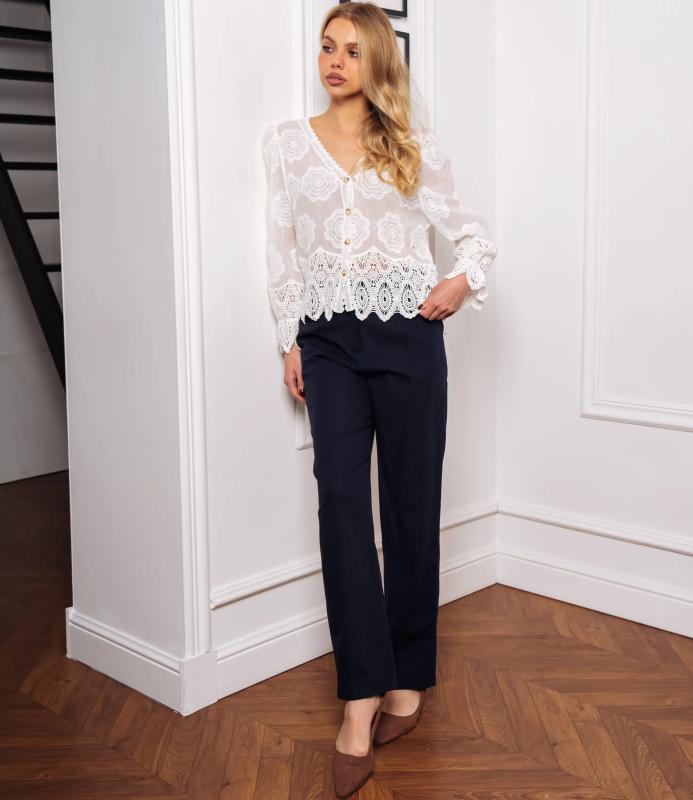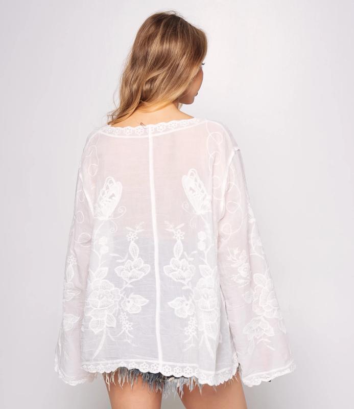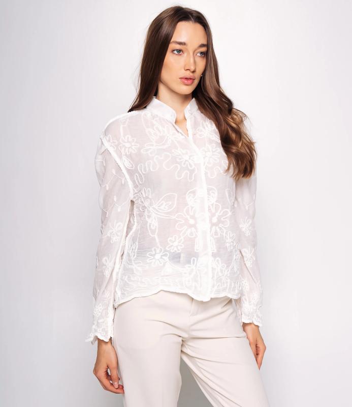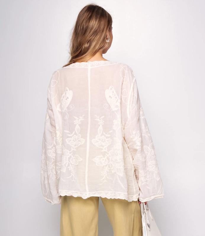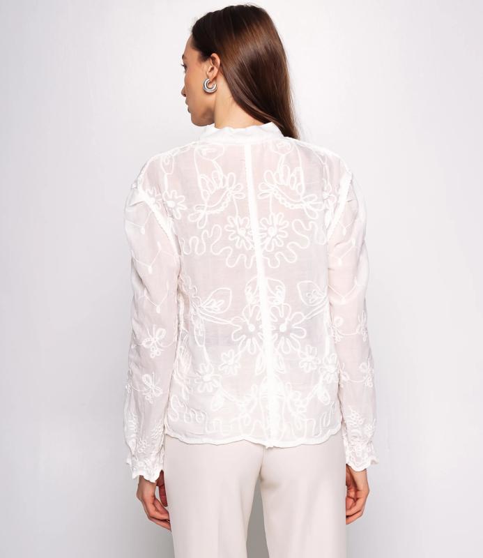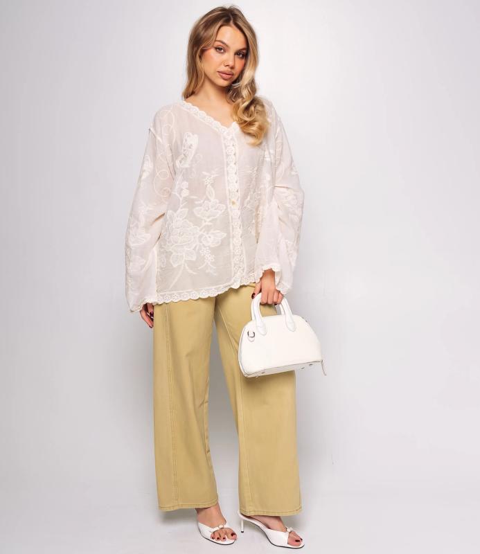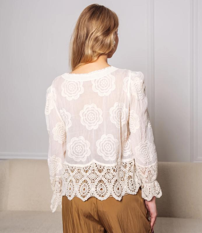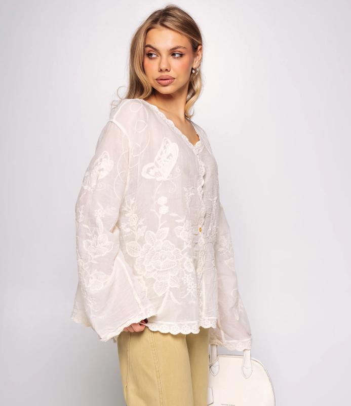 Блуза — это часть гардероба, которая подчёркивает привлекательность и индивидуальность любой женщины. Тонкая полупрозрачная ткань с крупным вышитым или кружевным цветочным узором, V‑образный вырез с узкой каймой, центральная планка с мелкими пуговицами, слегка приспущенные плечи, длинные рукава с широкими кружевными манжетами и волнистым краем, низ с широкой кружевной вставкой и зубчатыми краями, прилегающий к талии романтичный винтажный силуэт. Для пошива использована ткань: 100% хлопок. Мы предлагаем выгодные оптовые условия, гибкую ценовую политику и надёжные поставки для магазинов. Установленная цена адекватна и позволит вам формировать привлекательную наценку и обеспечивать высокую оборотность. Предложите своим покупательницам рубашку, сочетающую к