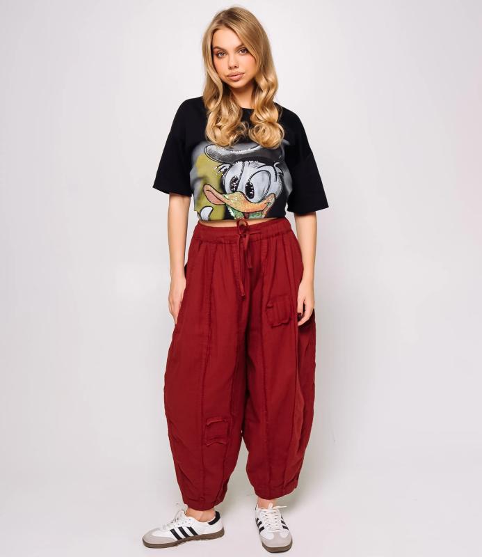 Брюки — это одежда, которая подчеркивает привлекательность любой женщины. Брюки свободного кроя из лёгкой мятой ткани. Эластичный пояс с завязками, широкие штанины с манжетами. Декоративные накладные карманы квадратной формы на бедре и колене. Вертикальные швы по длине. Мягкий материал, не сковывающий движения. Стиль — кэжуал с этническими мотивами. Для пошива использована ткань из 100% хлопок, которая характеризуется отменным качеством. Даже после многократных стирок изделие не утратит первоначальной привлекательности. Вы сможете предлагать их своим покупателям с радостью. Обратите внимание на цвет: он насыщенный и полностью соответствует фотографии на сайте. Чтобы вы были уверены в размере, мы представили на странице таблицу размеров. Воспользовавшись ею, вы сможете сами обмерить себя и удостовериться в п