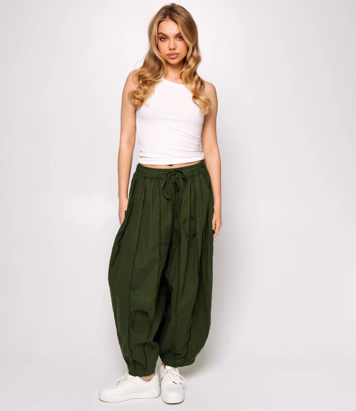 Брюки — это одежда, которая подчеркивает привлекательность любой женщины. Брюки свободного кроя из лёгкой мятой ткани. Эластичный пояс с завязками, широкие штанины с манжетами. Декоративные накладные карманы квадратной формы на бедре и колене. Вертикальные швы по длине. Мягкий материал, не сковывающий движения. Стиль — кэжуал с этническими мотивами. Для пошива использована ткань из 100% хлопок, которая характеризуется отменным качеством. Даже после многократных стирок изделие не утратит первоначальной привлекательности. Вы сможете предлагать их своим покупателям с радостью. Обратите внимание на цвет: он насыщенный и полностью соответствует фотографии на сайте. Чтобы вы были уверены в размере, мы представили на странице таблицу размеров. Воспользовавшись ею, вы сможете сами обмерить себя и удостоверитьс