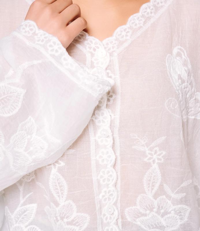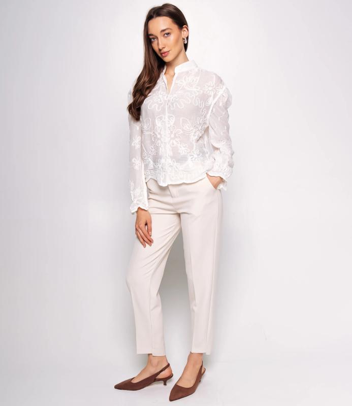 Блуза — это одежда, которая подчёркивает привлекательность каждой женщины. Блуза из полупрозрачной лёгкой ткани с цветочной вышивкой, рубашечного кроя, с отложным воротником и застёжкой на пуговицы. Длинные рукава расклёшенные, с сборками и фестончатым краем. Подол асимметричный, с изогнутой линией. Ткань драпируется свободно, вышивка равномерно распределена по изделию. Сочетает классику и романтичный стиль, универсальна для разных образов. Для пошива использован материал 100% хлопок. Ткань проста в уходе, сохраняет первоначальный вид и насыщенность цвета даже после многократных стирок, что делает изделие практичным и привлекательным для покупательниц. Цвета соответствуют фотографиям на сайте. На странице размещена таблица размеров