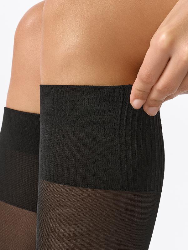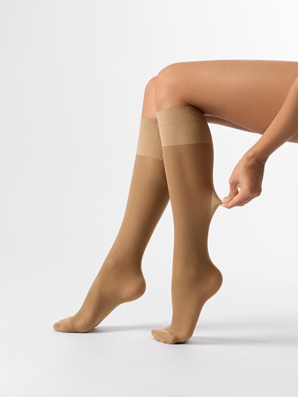 Матовые эластичные гольфы 40 DEN с распределённым давлением по ноге. Удобная резинка дифференцированной конструкции обеспечивает максимальный комфорт и мягко фиксирует гольфы на ноге, а укреплённый мысок повышает износостойкость и прочность.