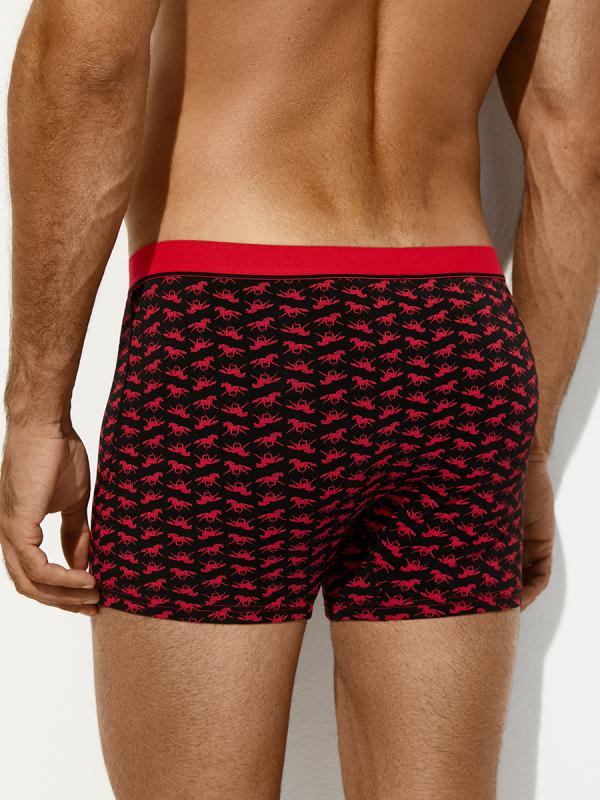 Мужские трусы-боксеры со средней линией талии, открытой брендированной резинкой и праздничным принтом.