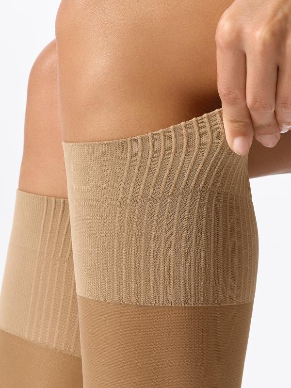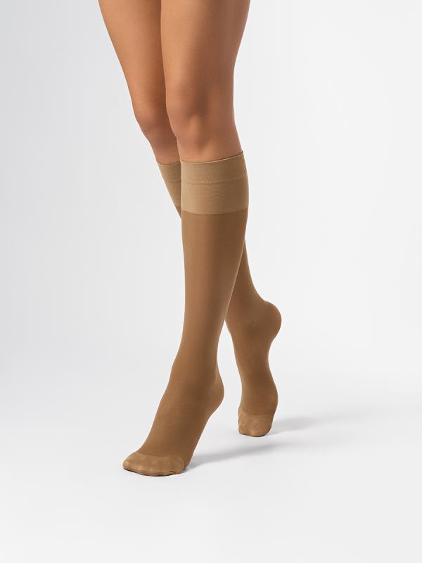 Тонкие матовые эластичные гольфы 20 DEN с распределённым давлением по ноге. Удобная резинка дифференцированной конструкции обеспечивает максимальный комфорт и мягко фиксирует гольфы на ноге, а укреплённый мысок повышает износостойкость и прочность.
