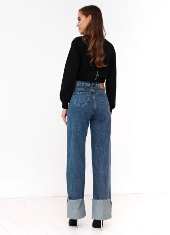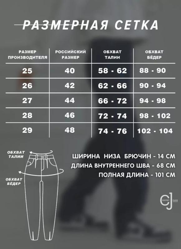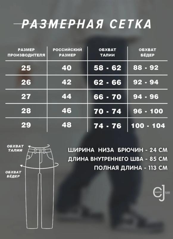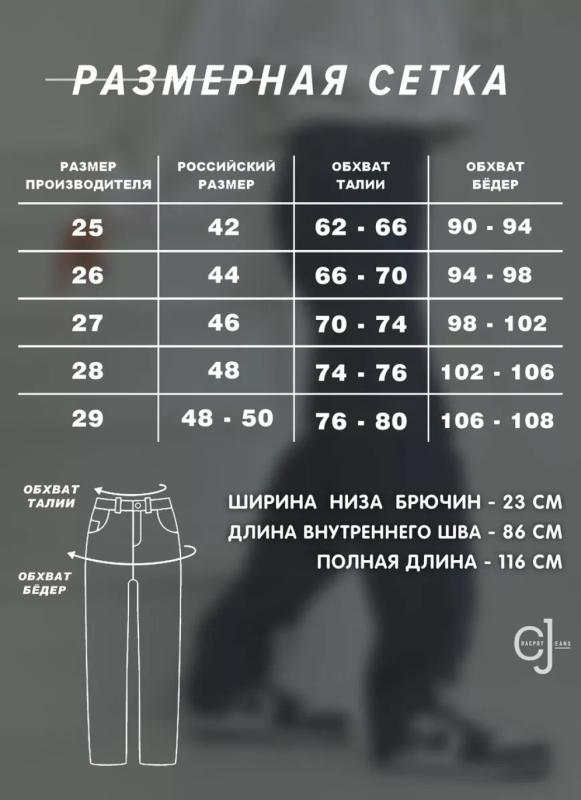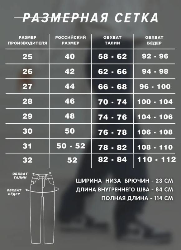 Параметры 25 размера. Полная длина 116, по внутреннему шву 86, ширина низа брючин 23 см. Рост модели на фото 173 см.