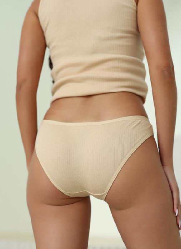 Женский комплект Berrak бежевого цвета: приталенная майка на широких лямках и трусики. Ткань в рубчик. Комплект изготовлен из 50% хлопка pamuk и 50% модала.