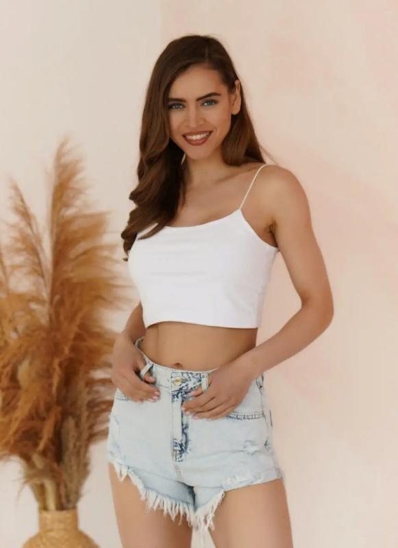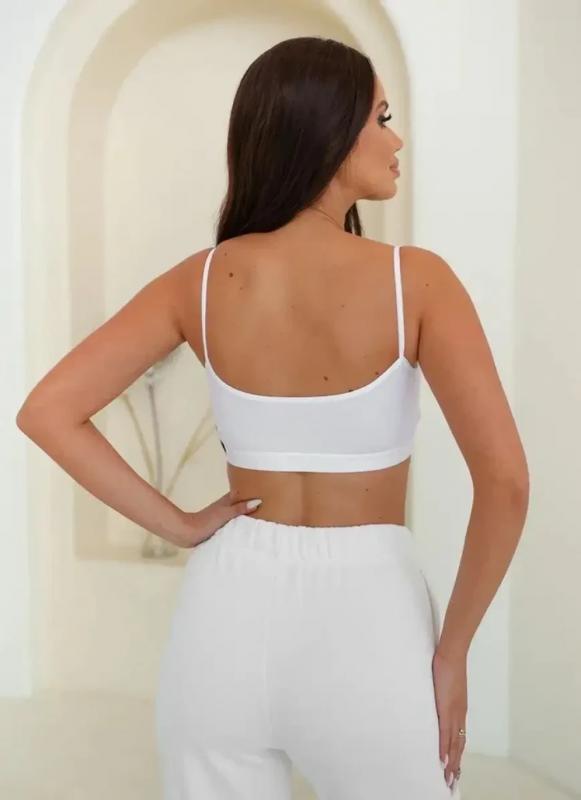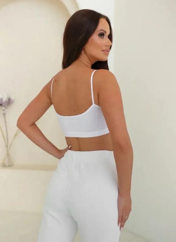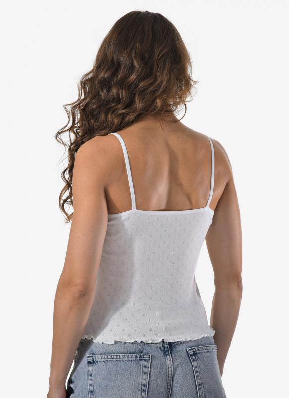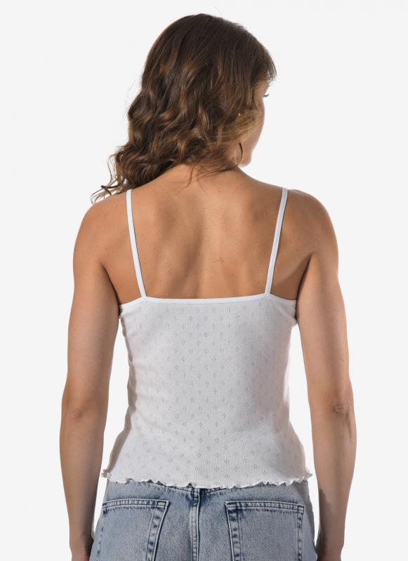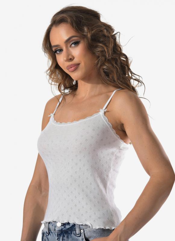 Женский топ на тонких нерегулируемых лямках выполнен из фактурной ткани в мелкий рубчик. В составе — 92% хлопка и 8% эластана, что обеспечивает комфорт, мягкость и отличную посадку по фигуре.