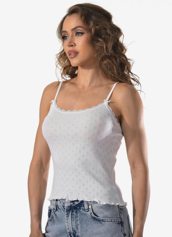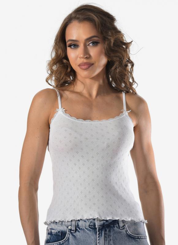Женская укороченная майка Berrak выполнена на тонких нерегулируемым лямках, что придает изделию элегантный и легкий вид. Ткань топа обладает интересной фактурой, добавляющей оригинальность и стиль. Ажурная окантовка горловины подчеркивает изящность и женственность модели. Эта майка станет отличным выбором для создания как повседневных, так и нарядных образов.