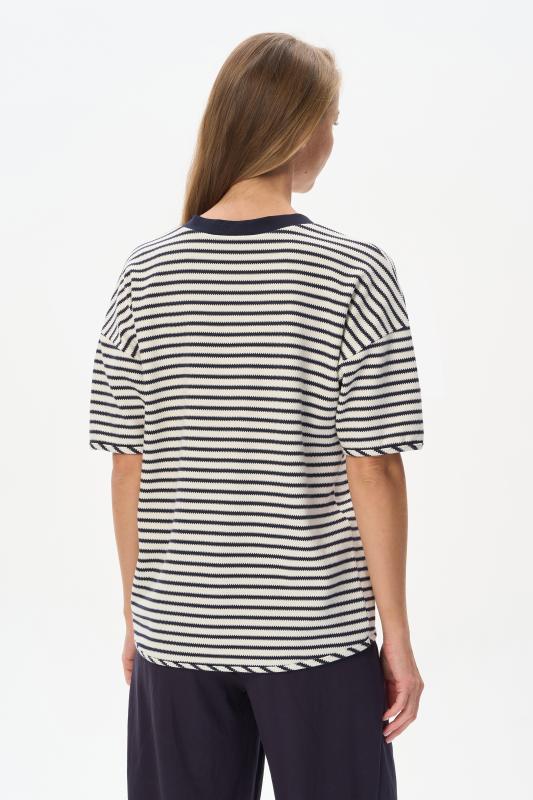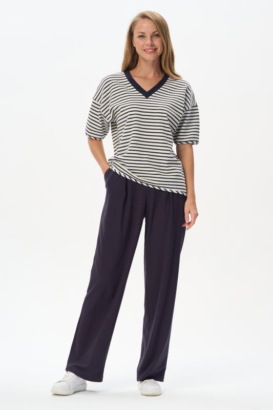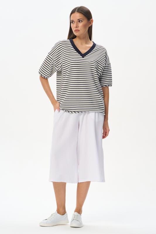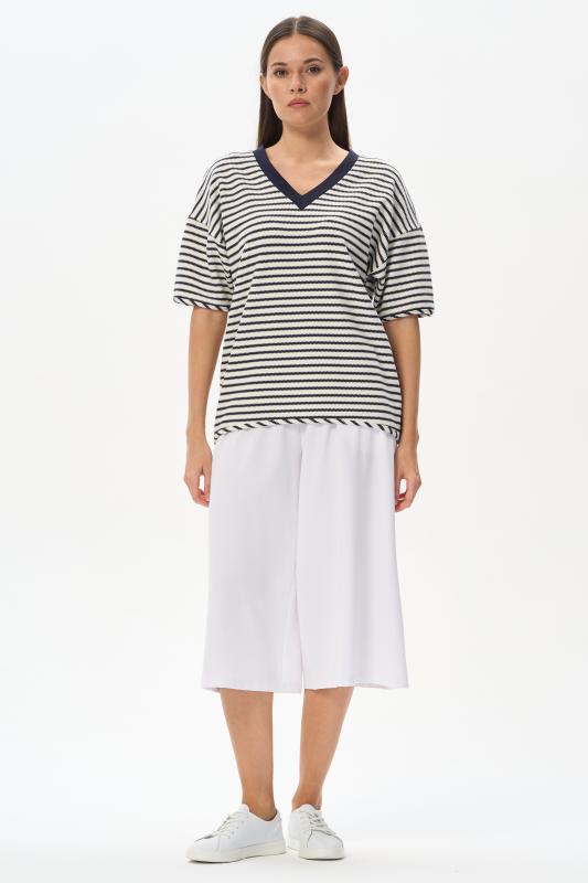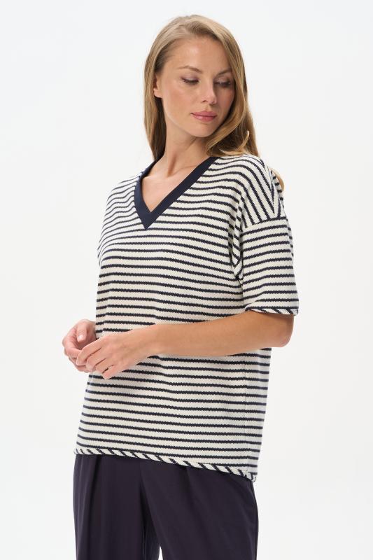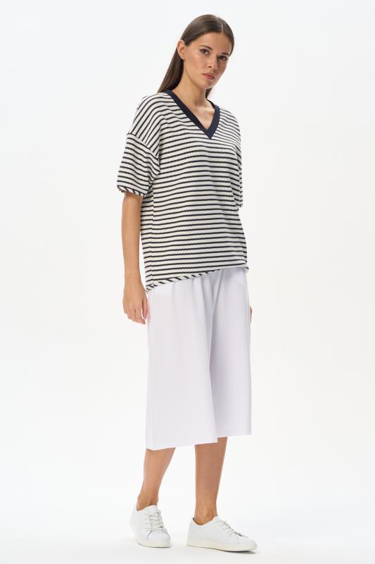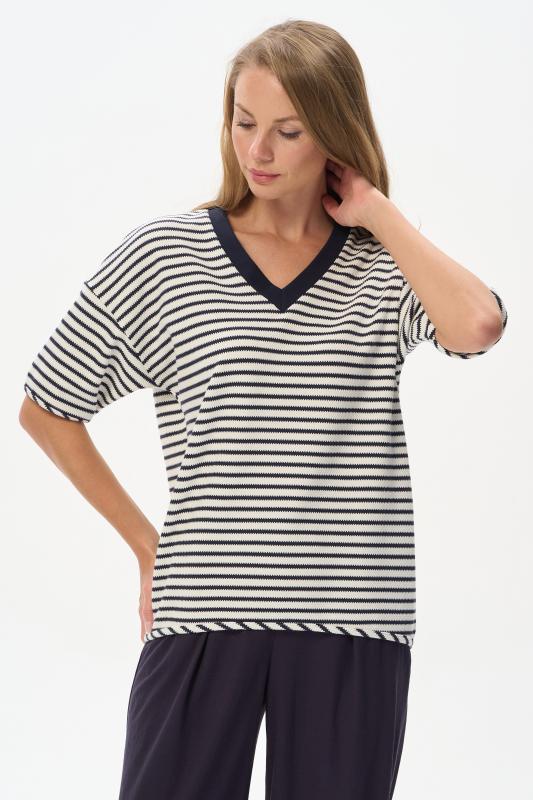 Джемпер из хлопкового жаккарда в бело-синюю фактурную полоску 280 гр. Модель с красивым V-образным вырезом, низ изделия овальной формы, рукава со спущенной проймой, длиной до локтя. Низ изделия и рукавов окантованы, что подчеркивает спортивный характер модели. Удобная, комфортная модель для летних образов в морском стиле и не только. Рост модели 175 см;Цвет: синий;Состав: 75% хлопок, 25% полиэстер