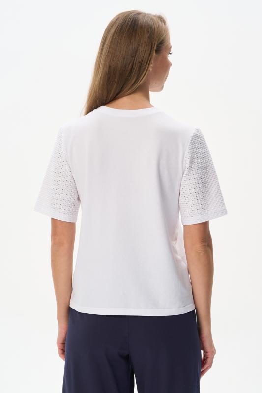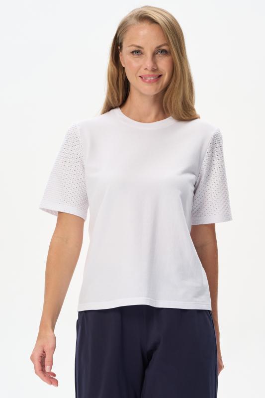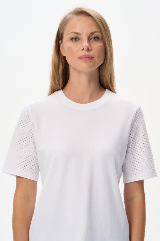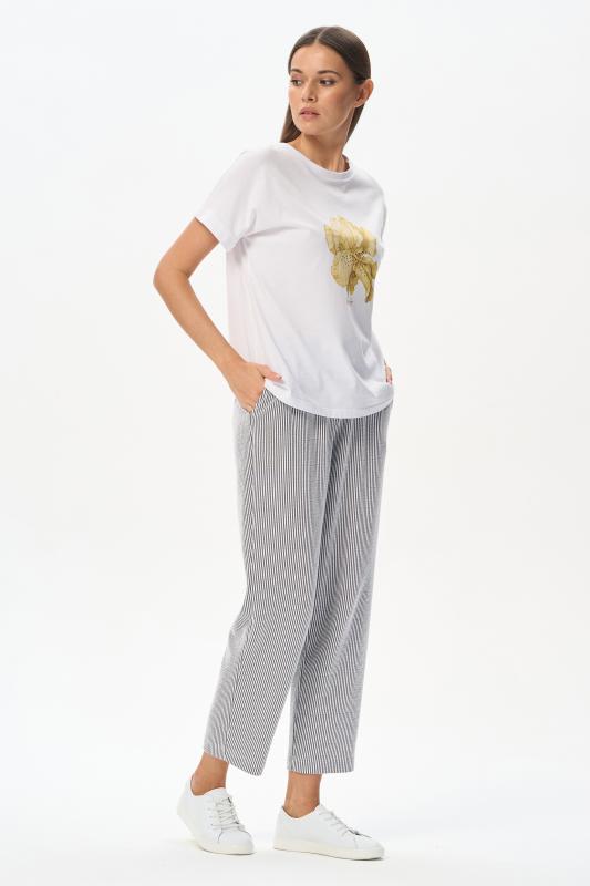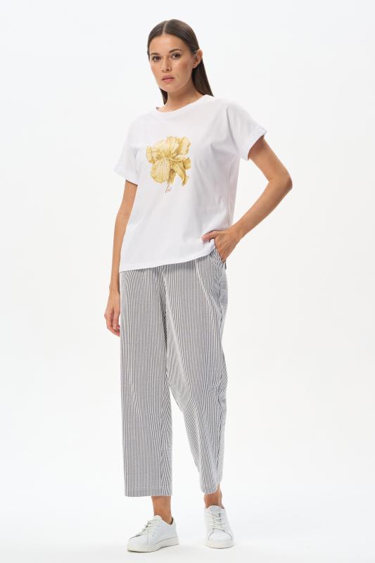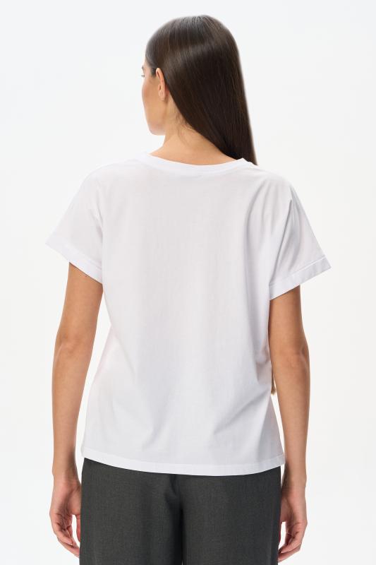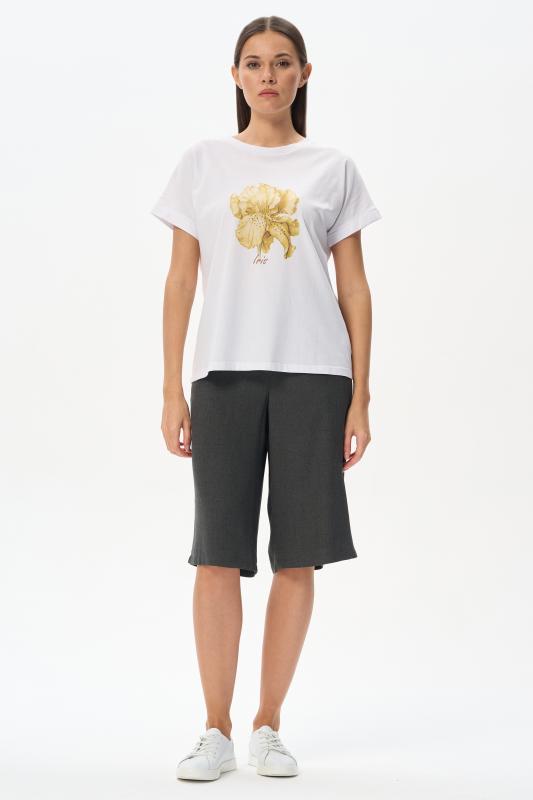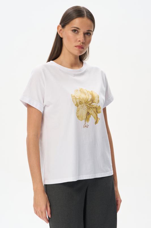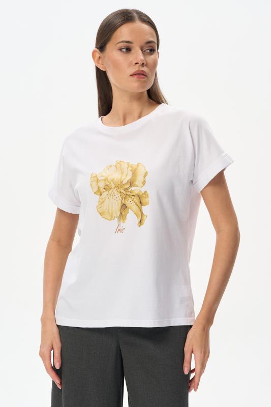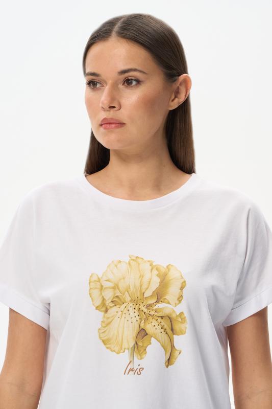 Белая футболка из хлопкового полотна качества пенье 150 гр. Модель с круглым вырезом горловины и цельнокроеными короткими рукавами с подворотом. Нежный ирис украшен блеском страз. Благодаря такой печати модель выглядит особенно эффектно и сделает ваш образ нарядным. Рост модели 175 см;Цвет: белый;Состав: 100% хлопок