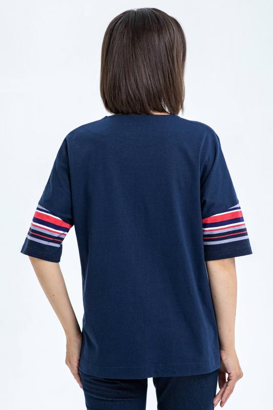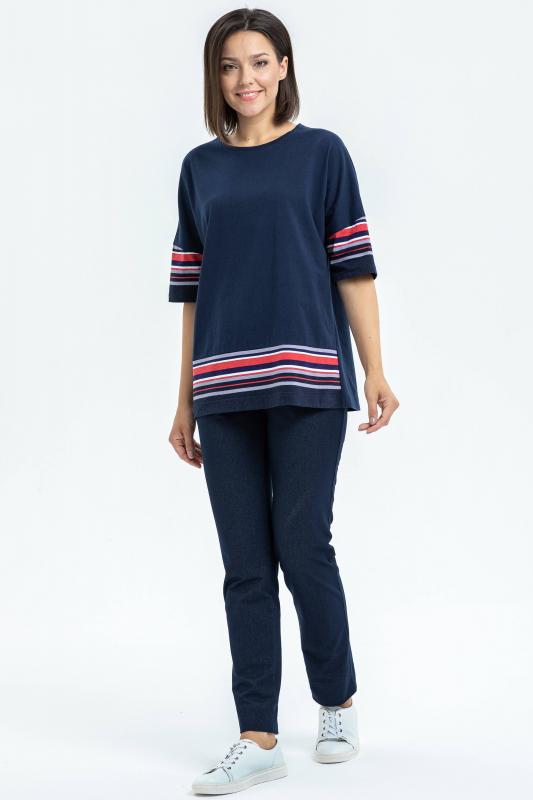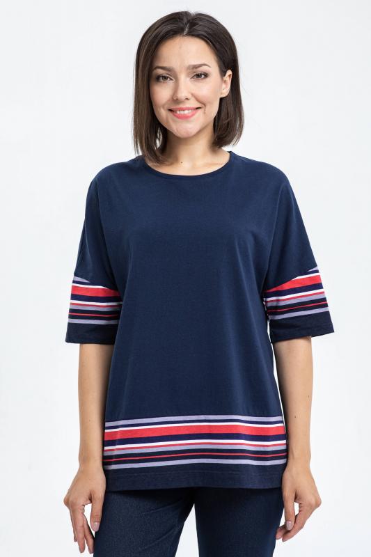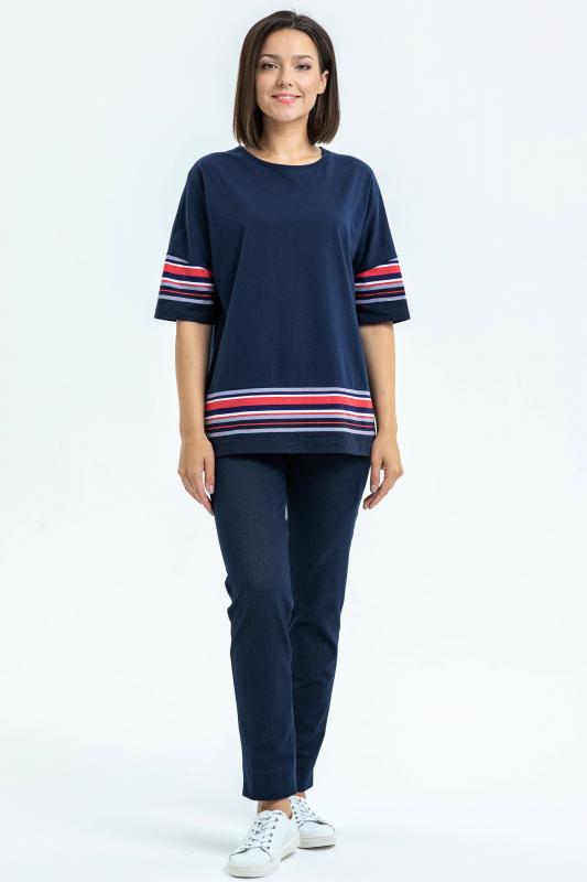 Свободная футболка из хлопкового трикотажного полотна качества пенье. Круглый вырез горловины, рукава длинной до логтя. Вставки по рукавам и низу полочки из отделочного хлопкового полотна. Рост модели на фото 170.;Цвет: тёмно-синий;Состав: 100% хлопок
