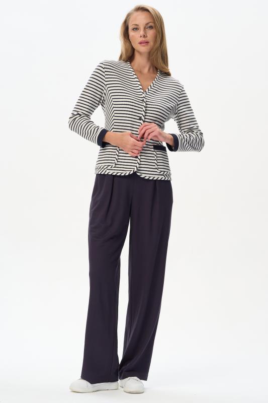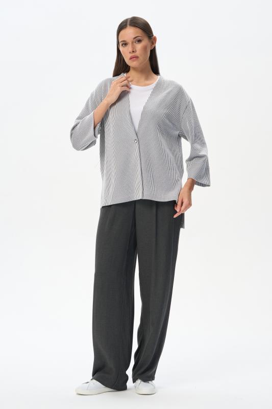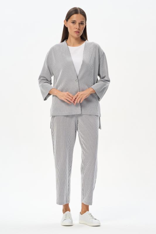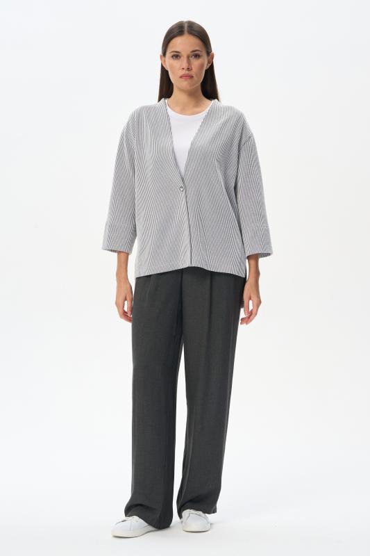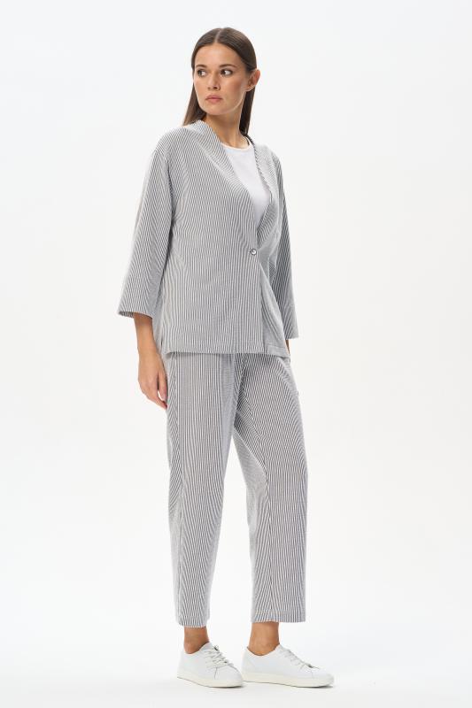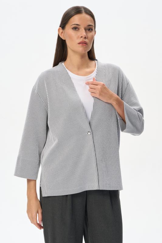 Лёгкий свободный жакет из эффектного хлопкового жаккарда в полоску 190 гр в оттенках Городской горизонт и Белый песок. Модель в стиле кимоно, спущенное плечо, прямой рукав 78, широкий пояс, с разным уровнем низа. Трендовое решение для весенне-летнего сезона. Жакет идеально подходит для офиса, сочетается с большим количеством моделей коллекции и сезона вцелом. Рост модели 175 см;Цвет: сине-серый;Состав: 70% хлопок, 25% полиэстер, 5% эластан