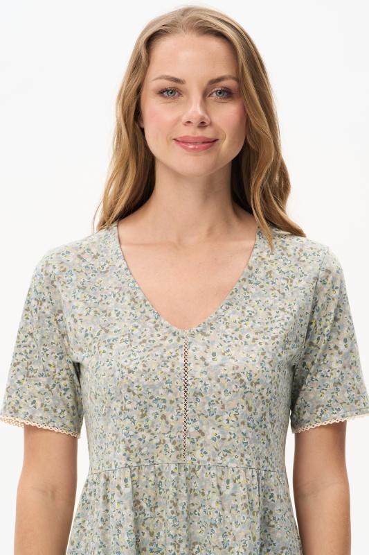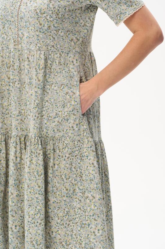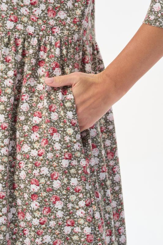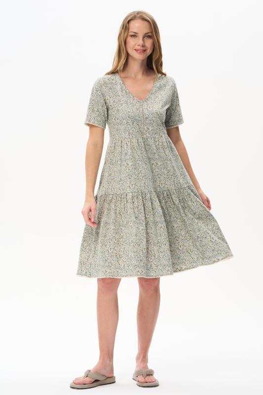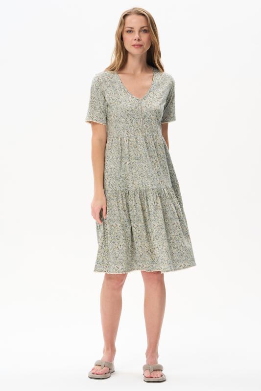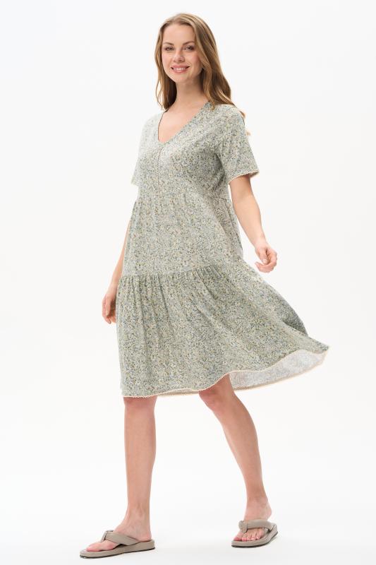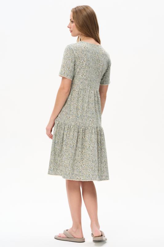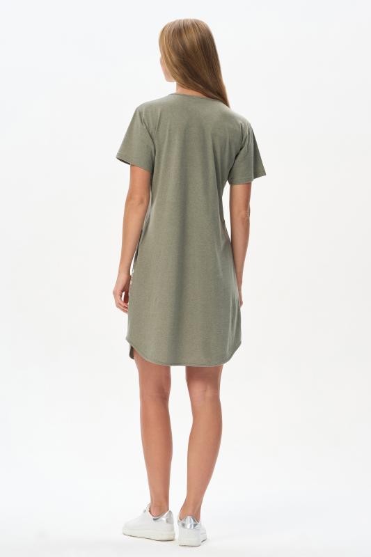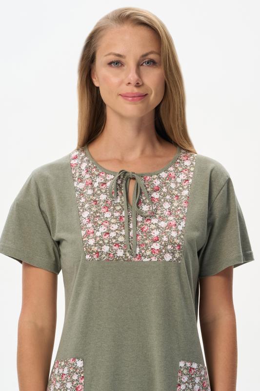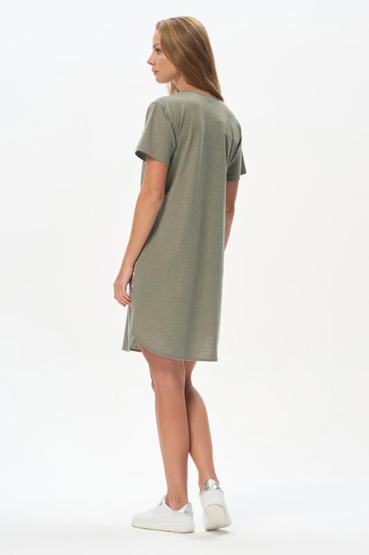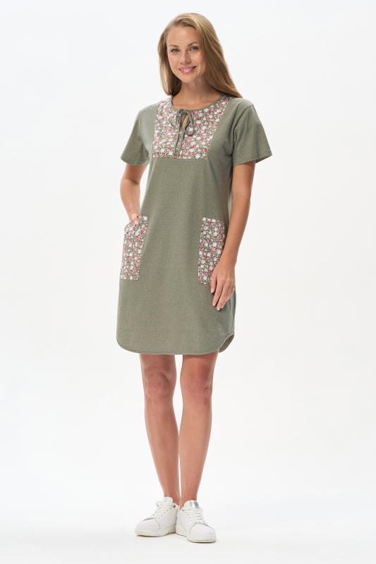 Платье А-силуэта выполнено из сочетания хлопкового и меланжевого трикотажных полотен. Спереди фигурная кокетка с завязкой, накладные карманы. Короткие втачные рукава. Фигурная линия низа изделия окантована. Длина платья до колена. Рост модели 175 см.;Цвет: оливковый;Состав: 70% хлопок, 30% полиэстер