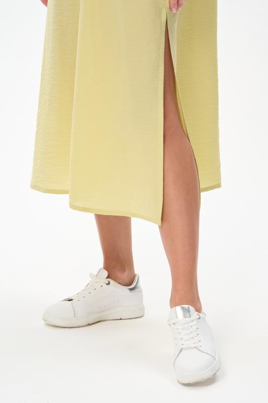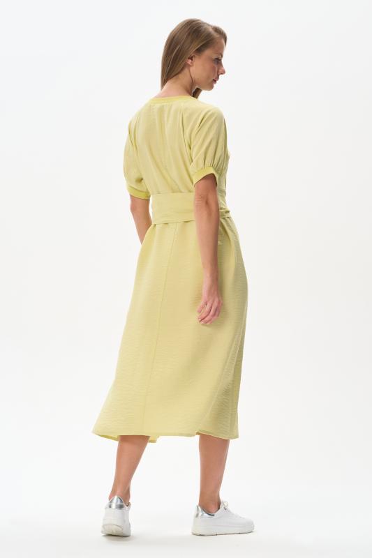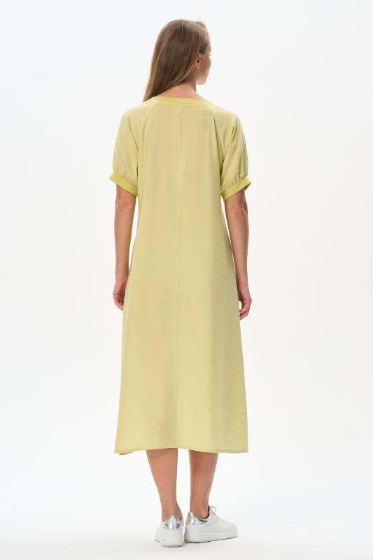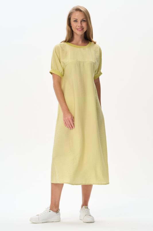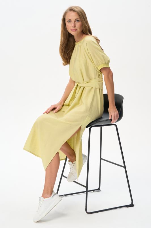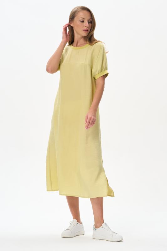Платье из лёгкой плательной ткани 120 гр в трендовом оттенке. Модель силуэта трапеция, дополнена поясом, с помощью которого можно менять силуэт. Круглый вырез горловины и спущенные рукава обработаны мягким кашкорсе. Платье ниже середины икр,с высоким разрезом в боковом шве. Лёгкая, свободная, комфортная модель для летних образов Рост модели 175 см;Цвет: жёлтый;Состав: 88% вискоза, 12% полиэстер