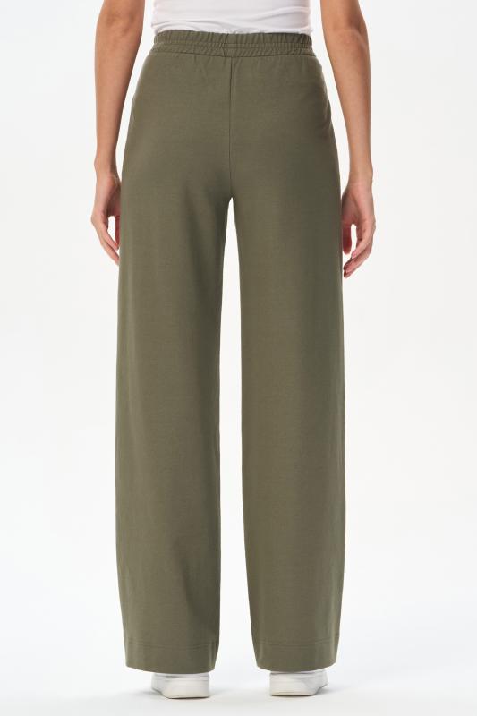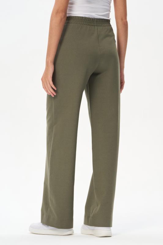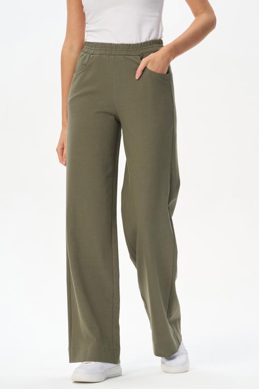 Прямые брюки с высокой посадкой. Выполнены из хлопковой трикотажной джинсы. Спереди фигурные карманы, пояс с эластичной лентой внутри. Длина по боковому шву (без пояса ) в 44 размере - 104см. Рост модели 175.;Цвет: зелёный;Состав: 80% хлопок, 14% полиэстер, 6% эластан