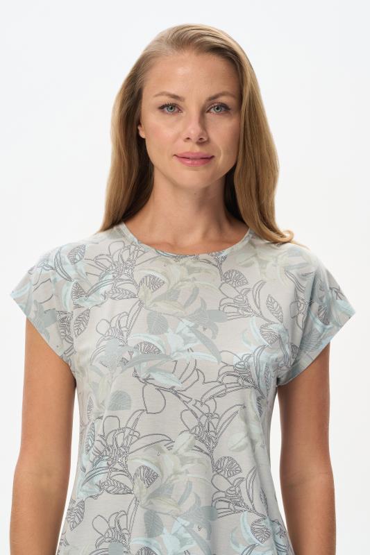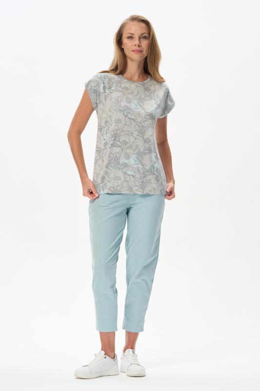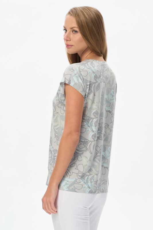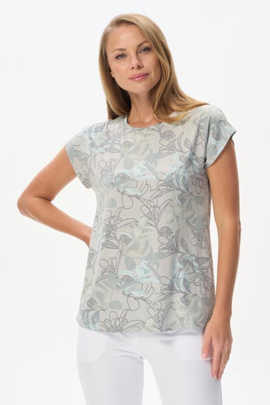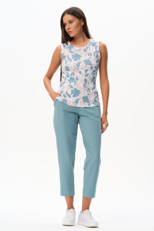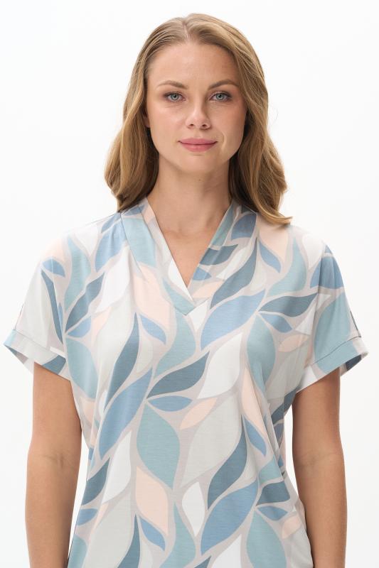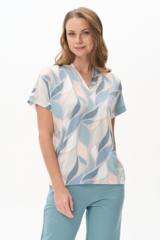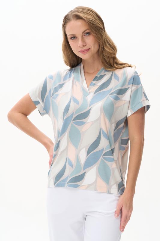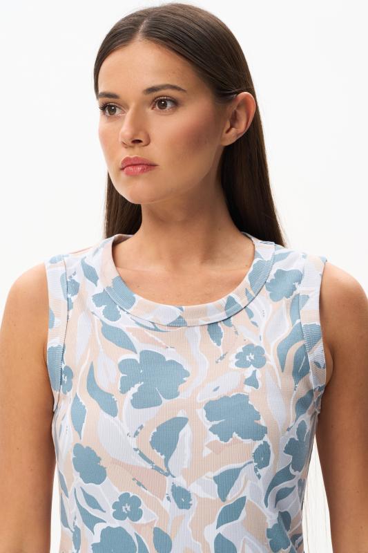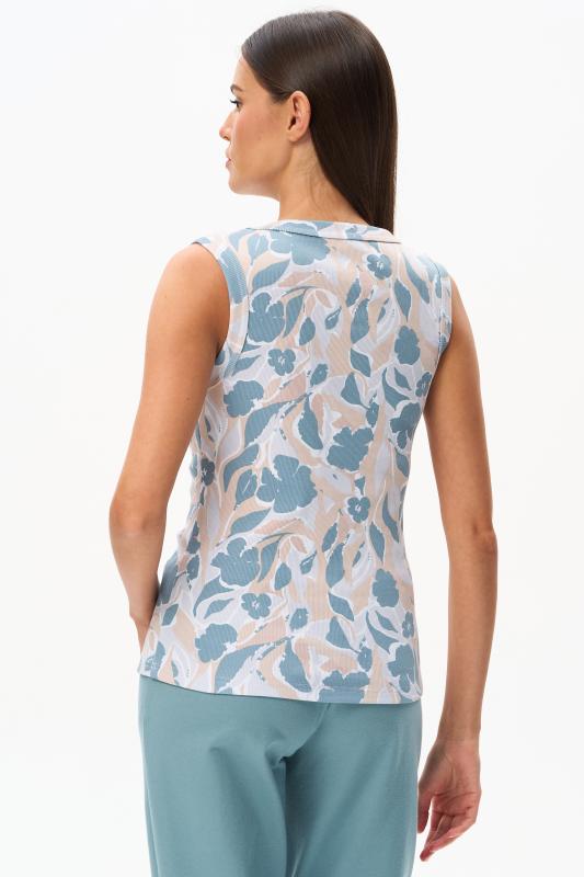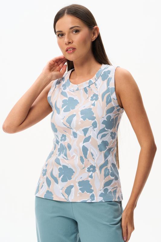 Майка из мягкого кашкорсе качества пенье c дизайнерским рисунком - Цветочная абстракция в приятных оттенках. Актуальная модель с широкой окантовкой. Сочетание майки с другими моделями коллекции позволяет создавать трендовые многослойные образы. Рост модели 175 см;Цвет: сине-бежевый;Состав: 92% хлопок, 8% эластан