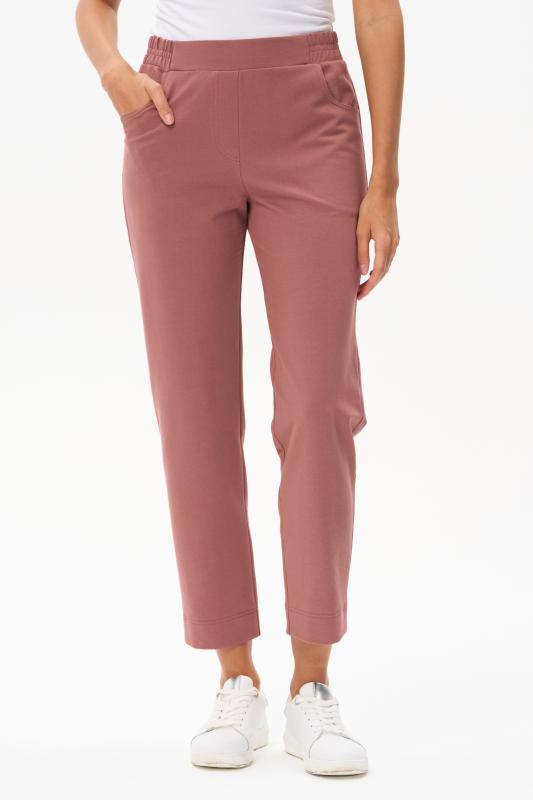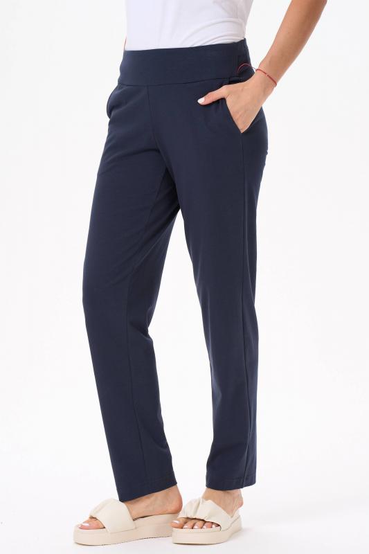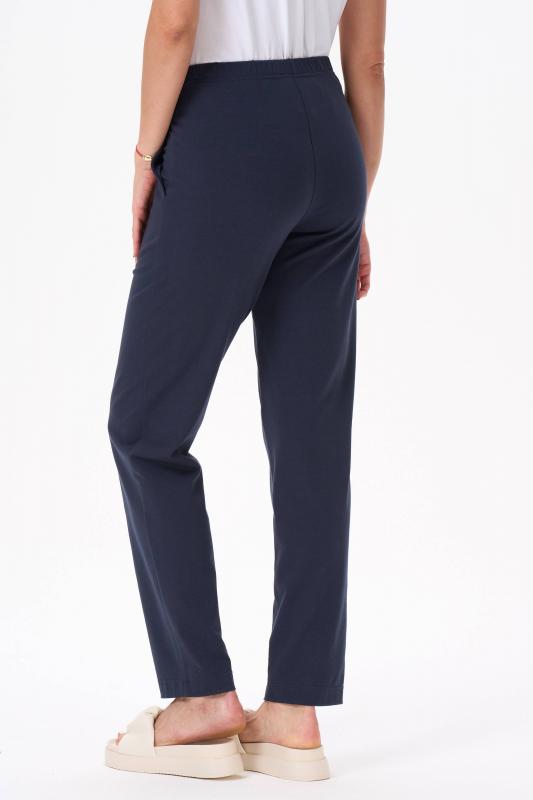Комфортные, чутьзауженные, брюки с карманами из хлопкового трикотажного полотна с эластаном. Удобство посадки обеспечивает спереди кокетка, по спинке цельнокроенный пояс с эластичной тесьмой. Рост модели на фото 170;Цвет: тёмно-синий;Состав: 80% хлопок, 14% полиэстер, 6% эластан