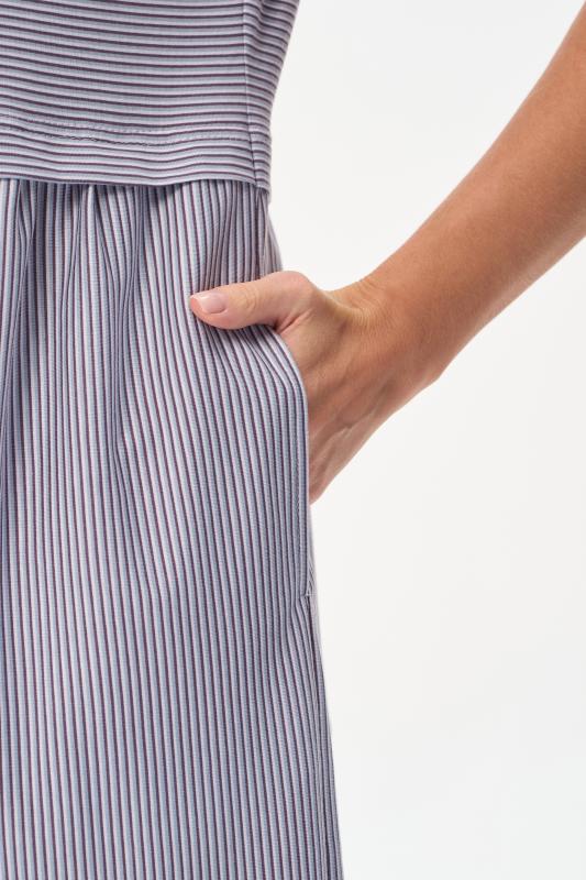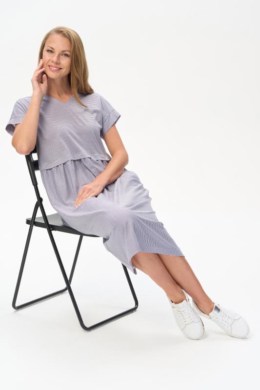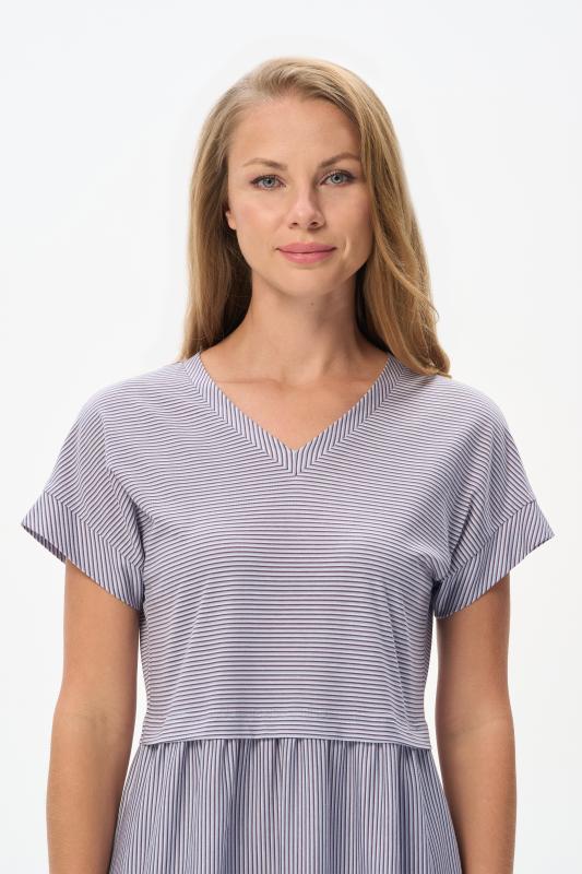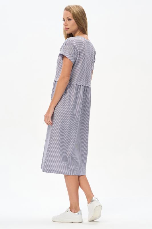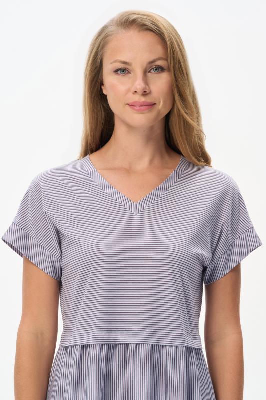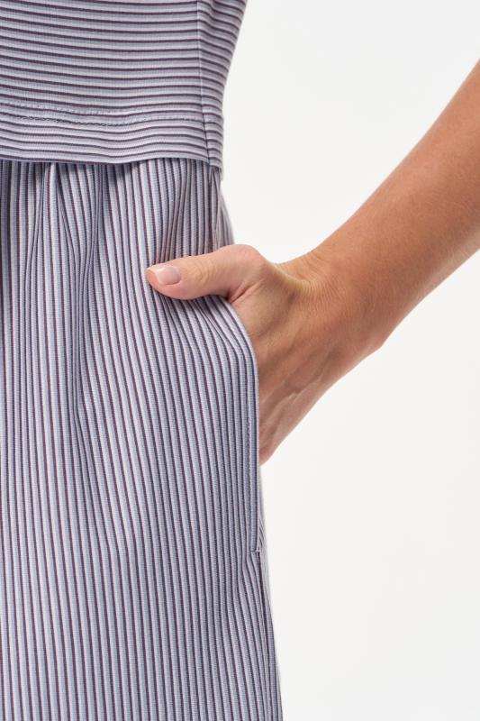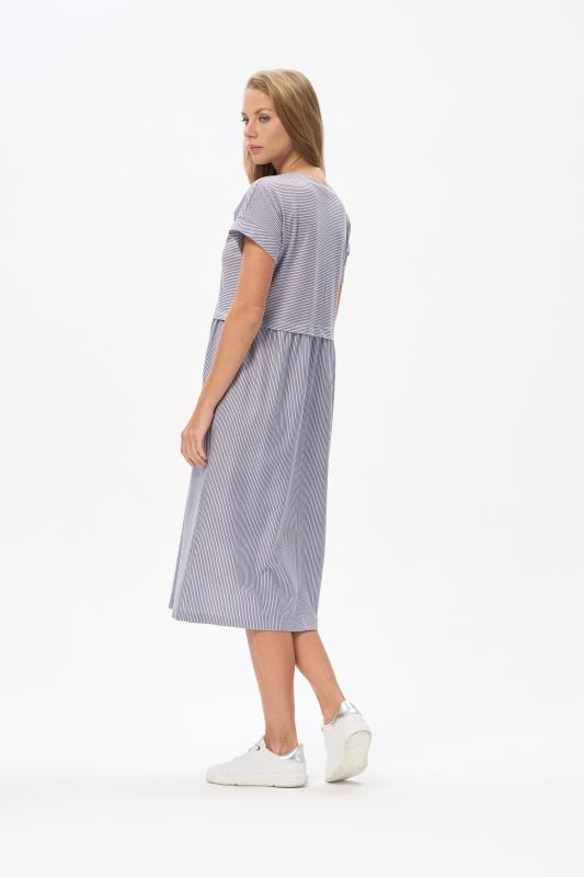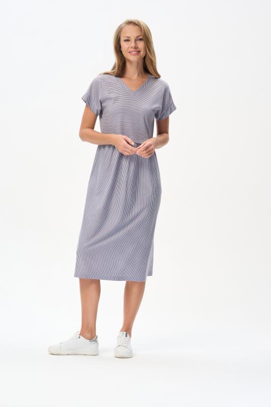 Комфортное платье в тонкую полоску в оттенках коллекции из хлопкового полотна качества пенье 150 гр Модель классического силуэта с чуть завышенной линией талии, с небольшой сборкой на полочке и спинке. Цельнокроеные короткие рукава, удобные карманы, V-образный вырез с планкой. Рост модели 175 см;Цвет: серо-голубой;Состав: 100% хлопок