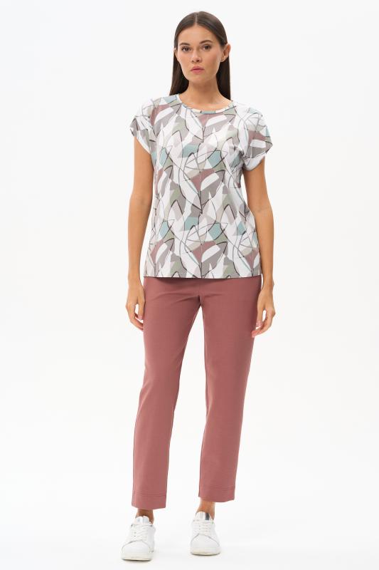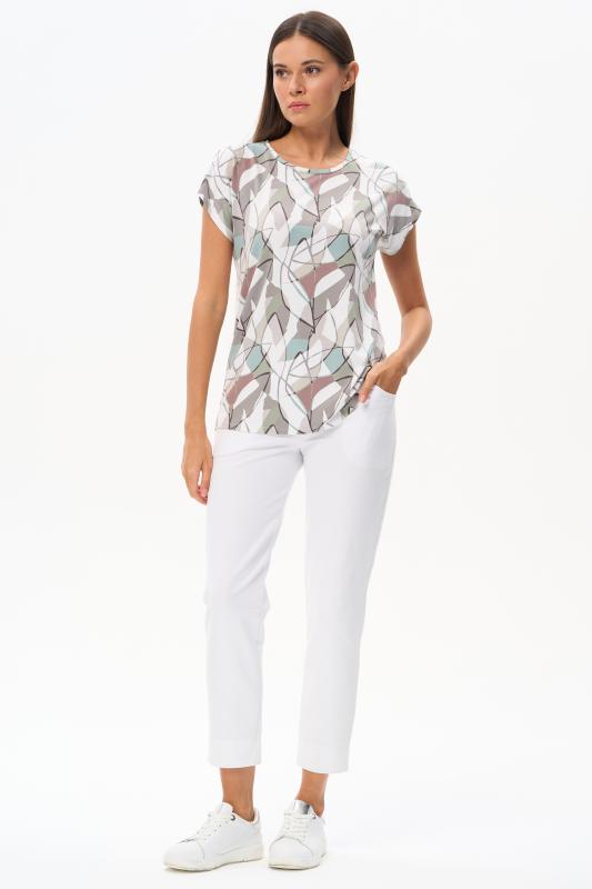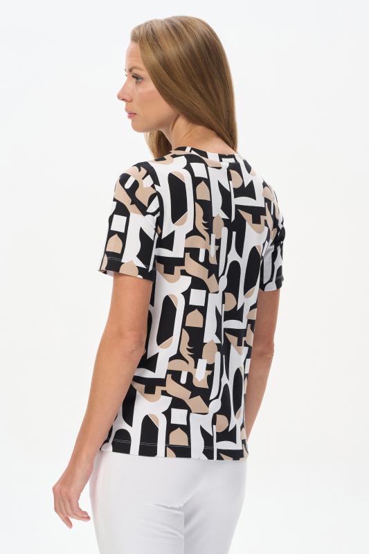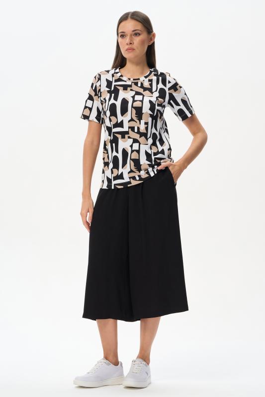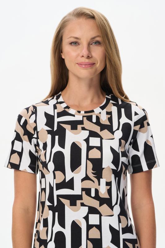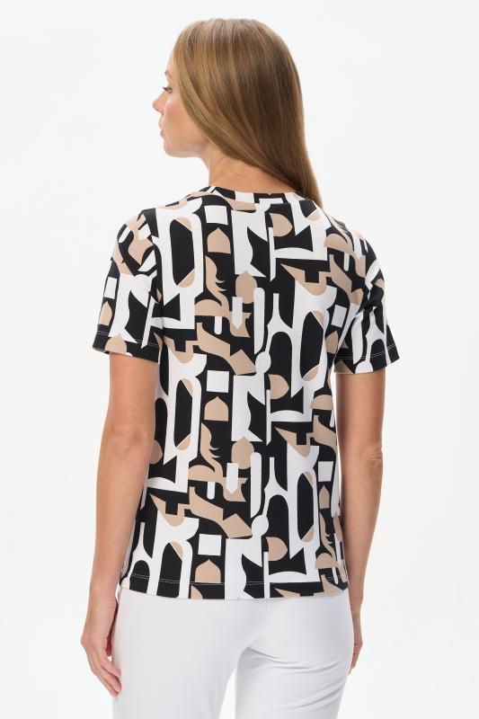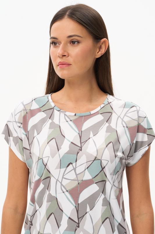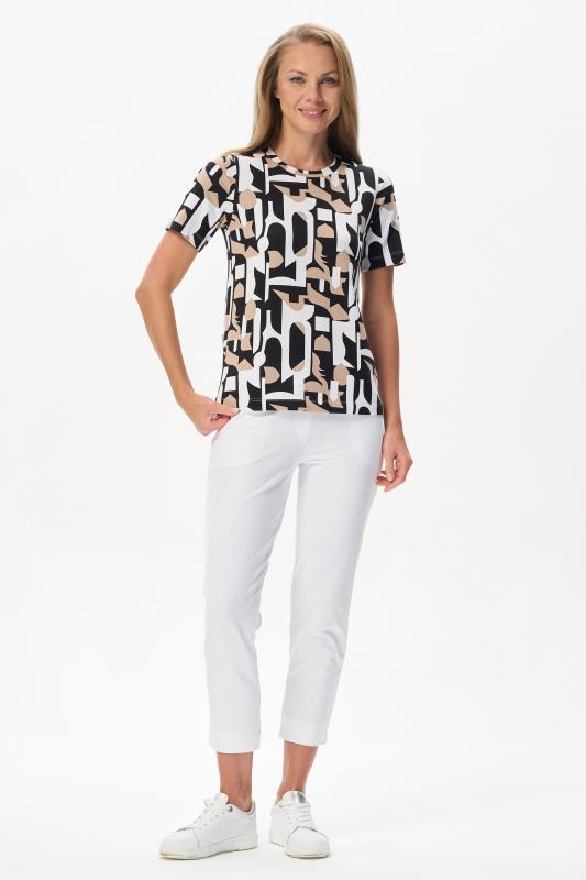 Футболка выполнена из пластичной рибаны с дизайнерским рисункоми. Модель прямого силуэта, круглый углубленный вырез, рукава втачные. Комфортная модель для повседневных образов с брюками и юбкой. Рост модели 175 см.;Цвет: мультиколор;Состав: 92% хлопок, 8% эластан