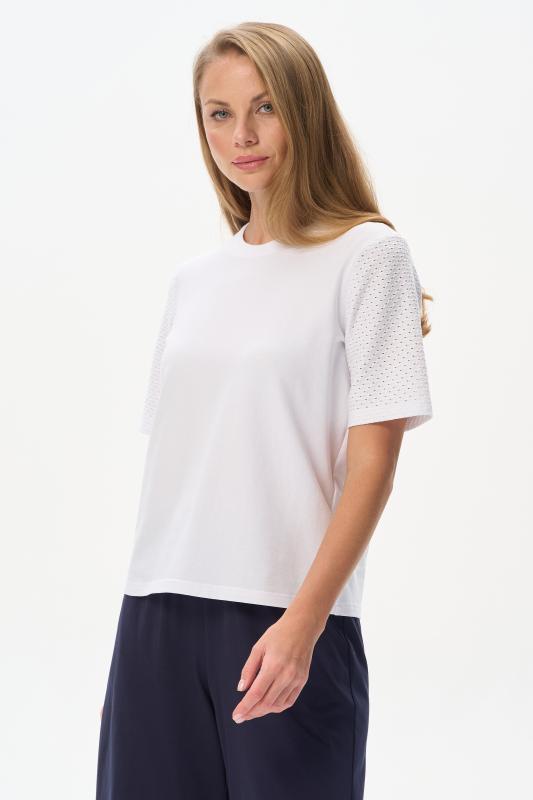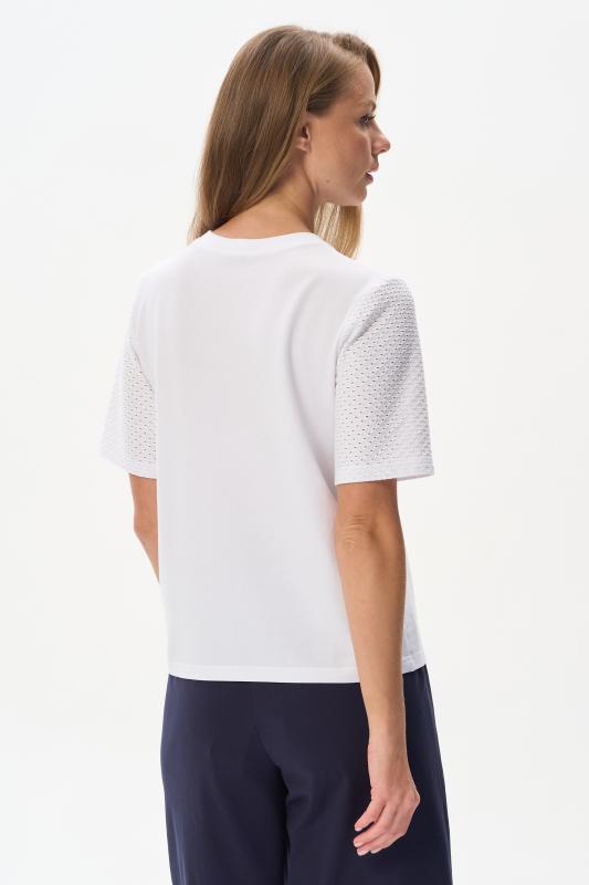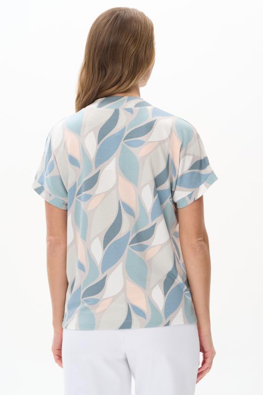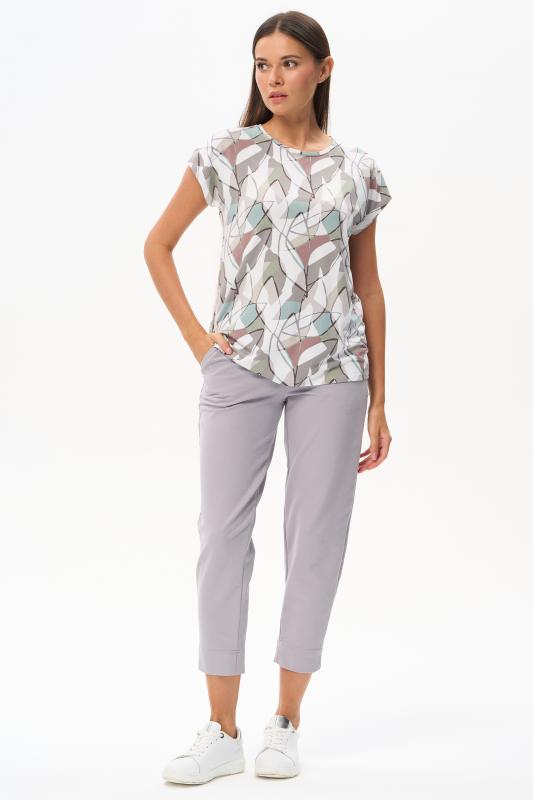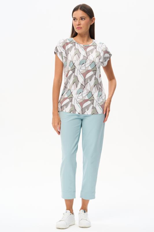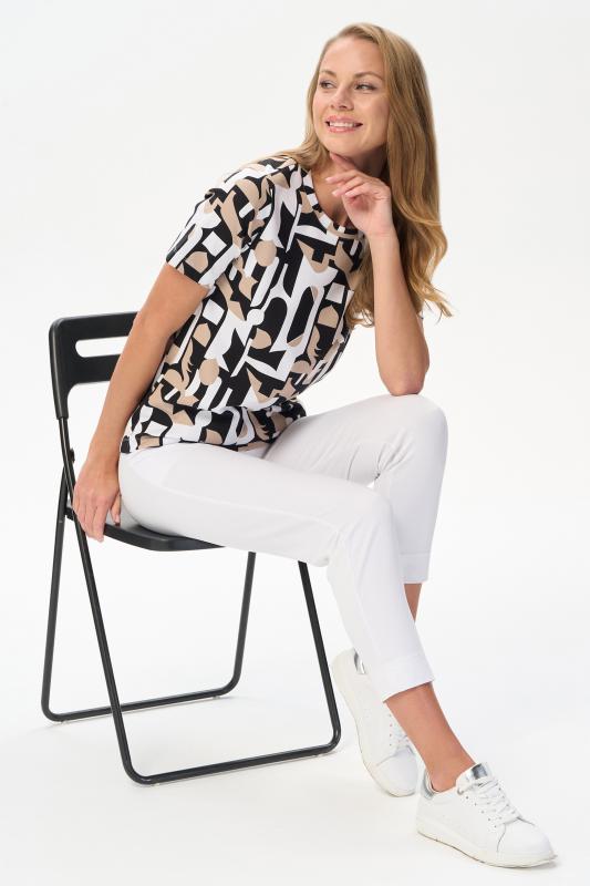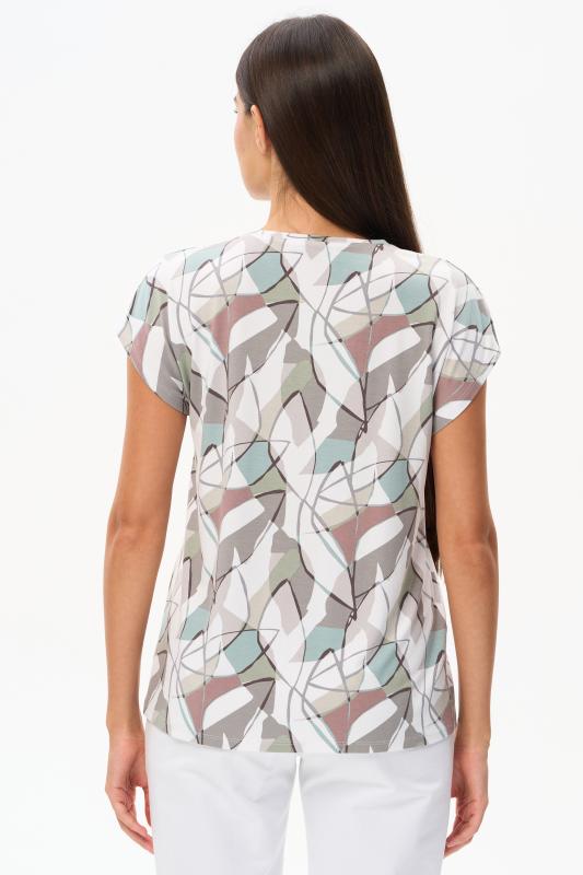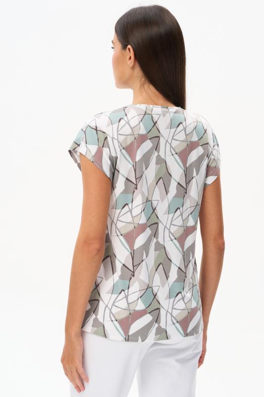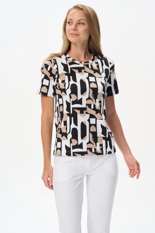 Футболка выполнена из пластичной рибаны с дизайнерским рисункоми. Модель прямого силуэта, круглый углубленный вырез, рукава втачные. Комфортная модель для повседневных образов с брюками и юбкой. Рост модели 175 см.;Цвет: мультиколор;Состав: 92% хлопок, 8% эластан