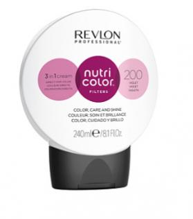 Rеvlоn Nutri Color Filters тон 200 240мл \ фиолетовый 240 мл Уже готовая к применению формула без аммиака, ее можно наносить непосредственно на волосы в качестве маски без добавления активатора или оксиданта. Прямой краситель без аммиака Rеvlоn Professional Nutri Color Filters сочетает в себе цвет и преимущества уходовой маски : увлажнение, блеск, уход. Его формула, богатая фруктовыми кислотами AHA, с питательными, увлажняющими и смягчающими свойствами, смягчает и разглаживает поверхность волос, закрывая кутикулы, защищает волосы от статического электричества и придает интенсивный блеск, не утяжеляя волосы. Волосы здоровые и сияющие, цвет насыщенный и яркий. Способ применения : После мытья головы нанесите, как бальзам, расческой или руками и оставьте примерно на 3-5 минут. Дайте ему поработать 15 минут для создания фантастических эффектов. Затем осторожно смойте теплой водой. Рекомендуется использовать перчатки при окрашивании, так как интенсивные цвета также окрашивают кожу и ногти. Объем : 240 мл