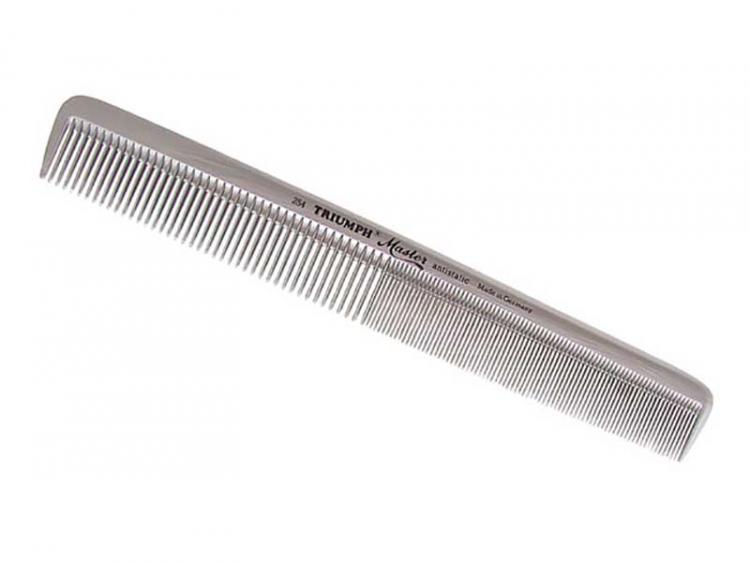 Triumph расческа рабочая для стрижки 95-254 (х) Пластиковая расческа с редкими и частыми зубчиками, имеющая антистатическое покрытие и предназначенная для стрижки. Размер 18 см, цвет - серебристый. Страна производитель : Германия.