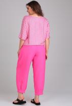 Комфортный летний брючный комплект для повседневной носки. Брюки-шаровары из легкой ткани — лен-вишер, которая хорошо держит форму, длиной 7-8, с поясом на резинке и боковыми карманами. Укороченный блузон свободного кроя из натуральной приятной на ощупь вискозы, имеет кулиску по низу изделия, которой можно регулировать плотность прилегания. Цельнокроеный рукав, округлая горловина. По переду блузона в качестве декора аппликация «love». Комплект отлично сочетается с любой по стилю обувью, он прекрасно вольется в Ваш гардероб, благодаря своей универсальности. . Длина жакета по спинке 57 см, длина рукава от горловины 33 см. Длина брюк по боковому шву 95 см, по шаговому 64 см. Изделие подойдет на рост 170 см..