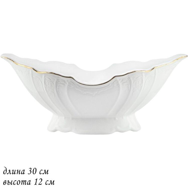 Фруктовница 30см, высота 12 см Упаковано в подарочную коробку Коллекция Maria Gold выполнена в стиле барокко и производится из тонкого белого фарфора c золотой каймой. Изделия украшены рельефным декором, изящно подчеркивающими благородство фарфора, узорные края выглядят элегантно и всегда в тренде посудной моды. Кроме наборов и сервизов в серию входят множество отдельных фарфоровых предметов, ассортимент которых с каждым годом расширяется. Эта посуда подходит как для ресторанов, бара и кафе, так и для дома. Не рекомендуется использовать в микроволновой печи и мыть в посудомоечной машине, по причине возможного повреждения декоративного покрытия.