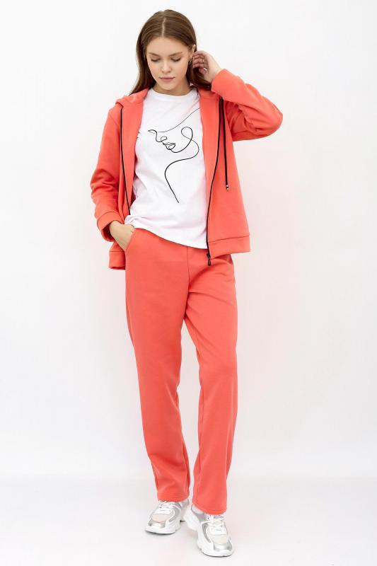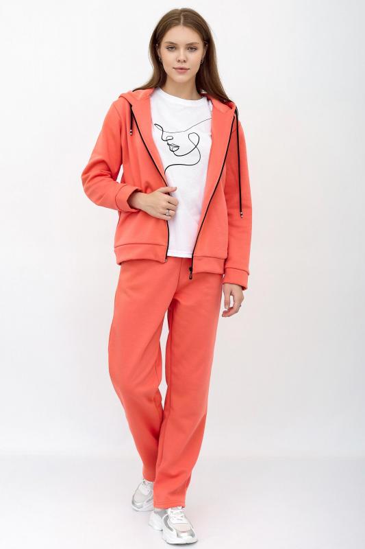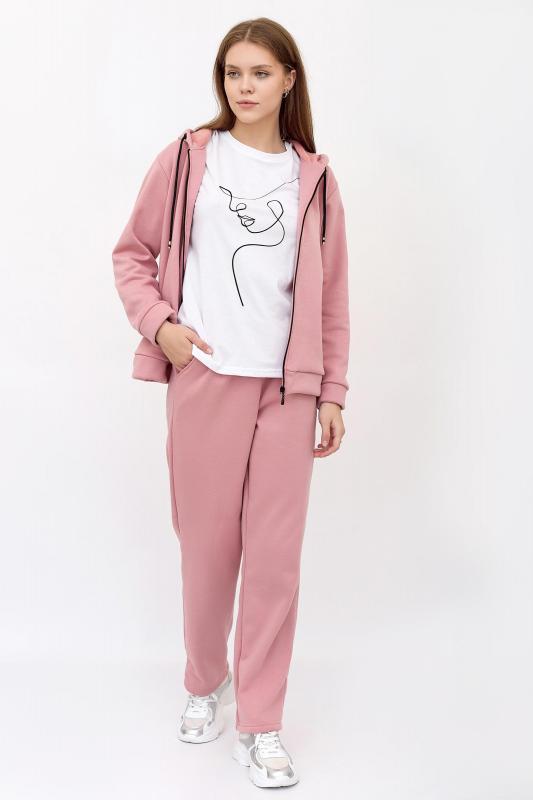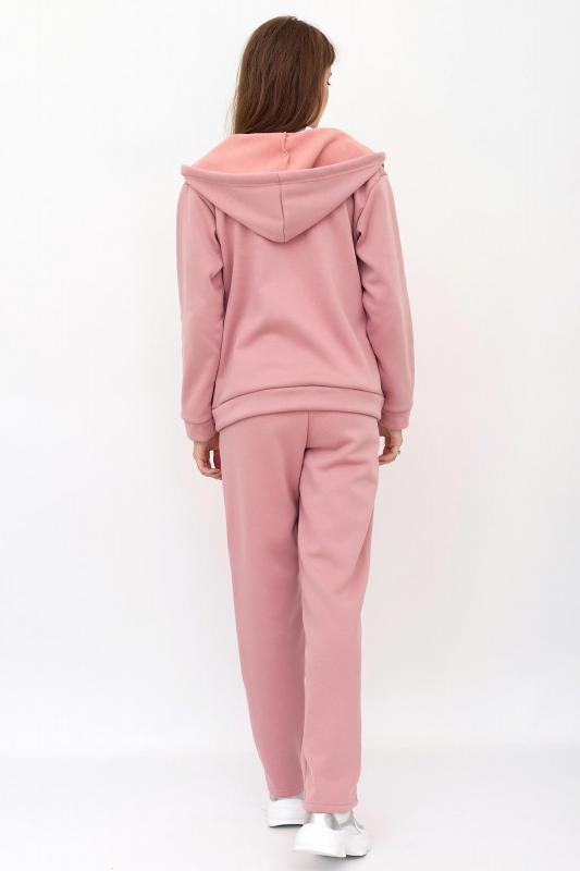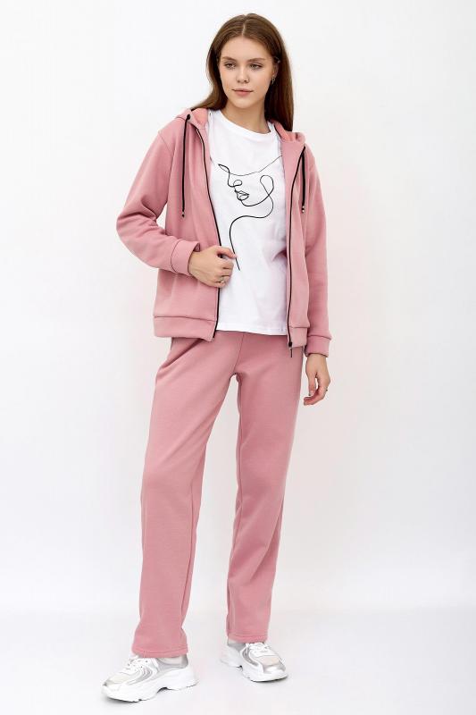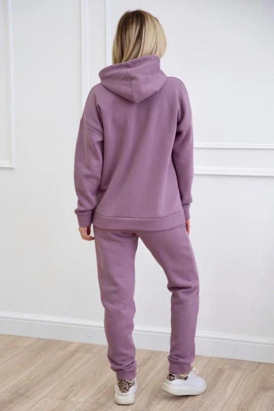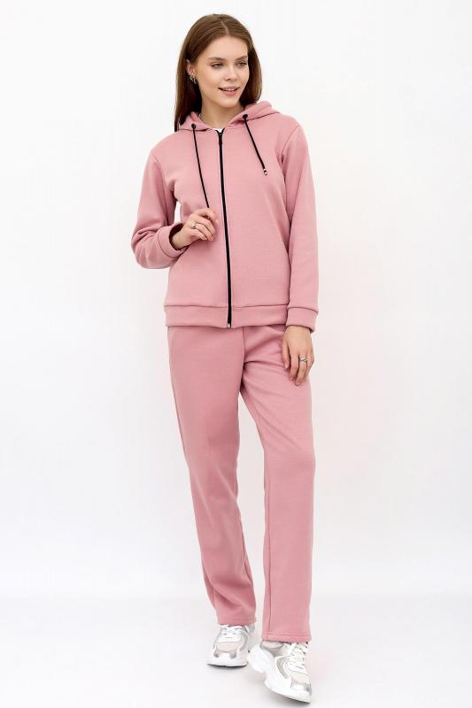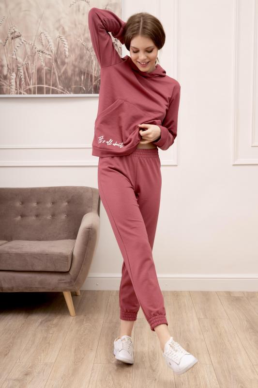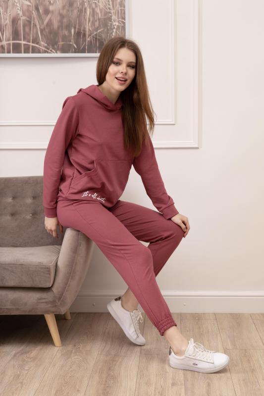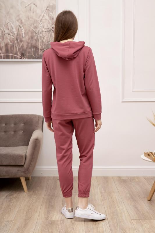 Модный фасон костюма Моника подарит Вам удобство и комфорт движений. Нежный цвет брусники находится сейчас на пике популярности и означает, что Вы в тренде модных новинок одежды. Свободный костюм визуально смотрится стильно и очень красиво. Капюшон и карманы на худи добавят больше удобства в носке. Штаны фиксируются резинками на талии и штанинах. Универсальная модель костюма позволит комбинировать вещи и с другой одеждой.