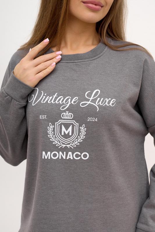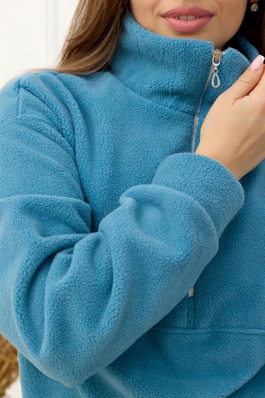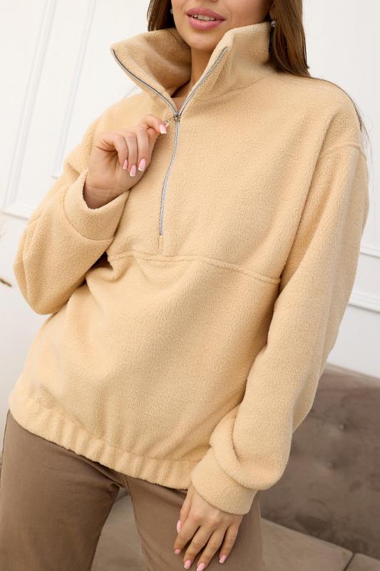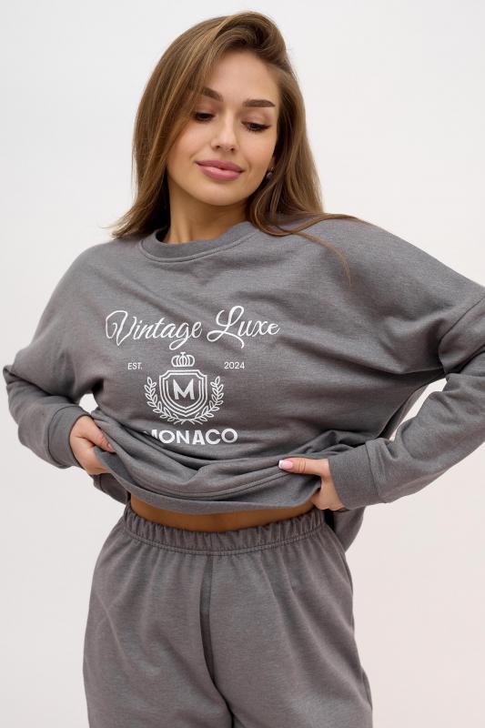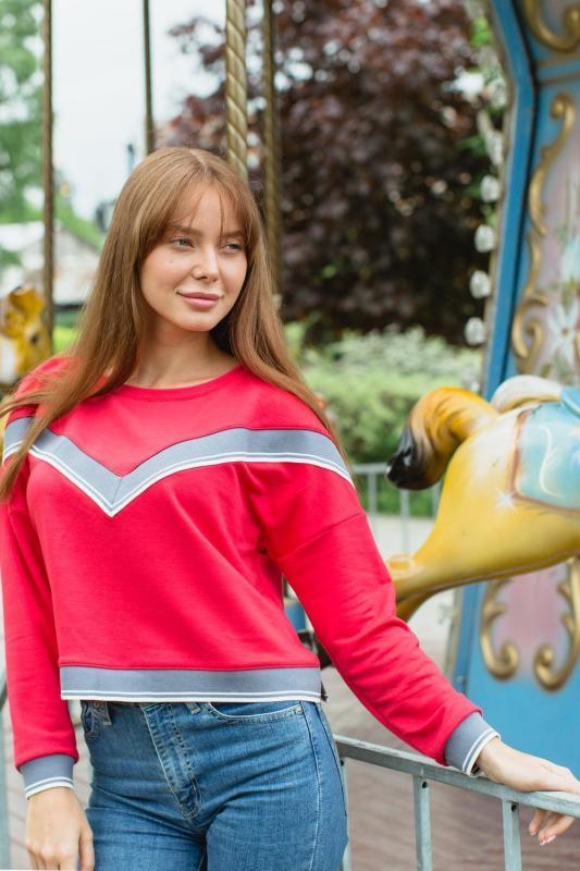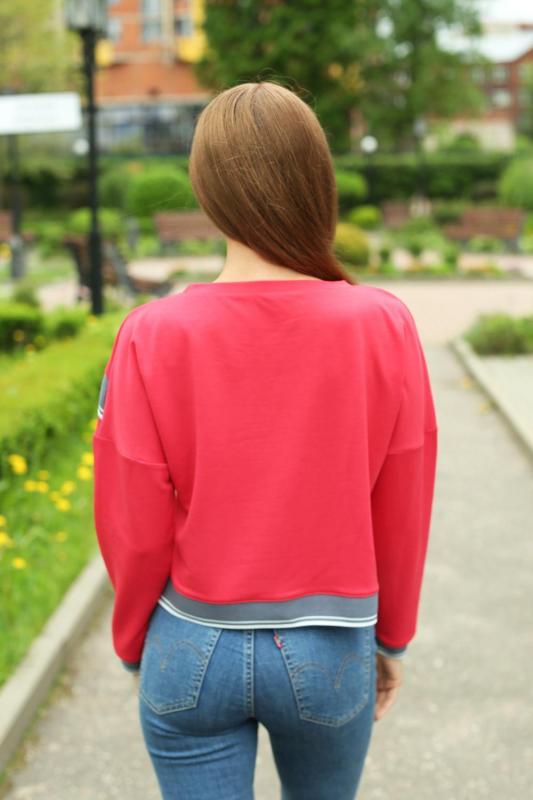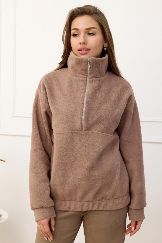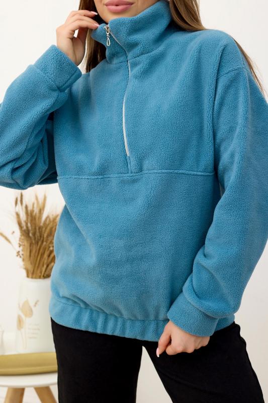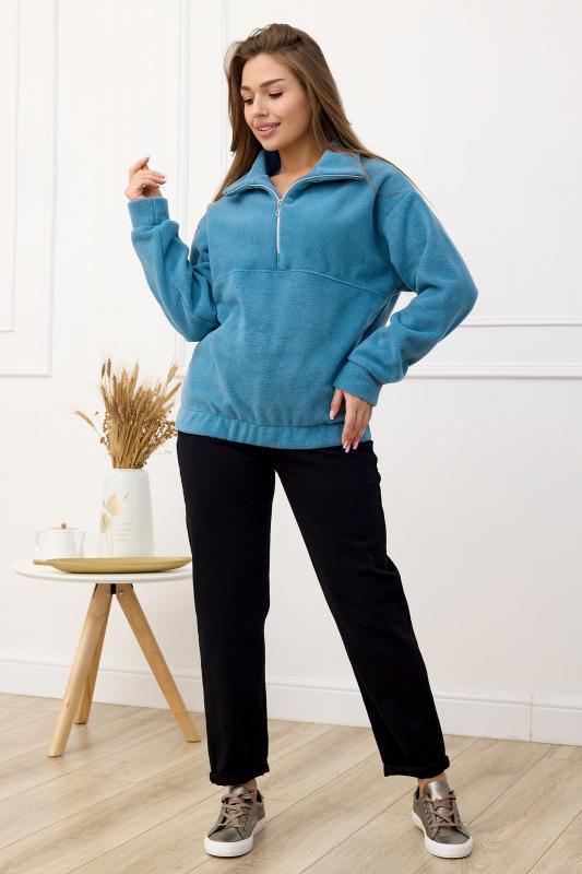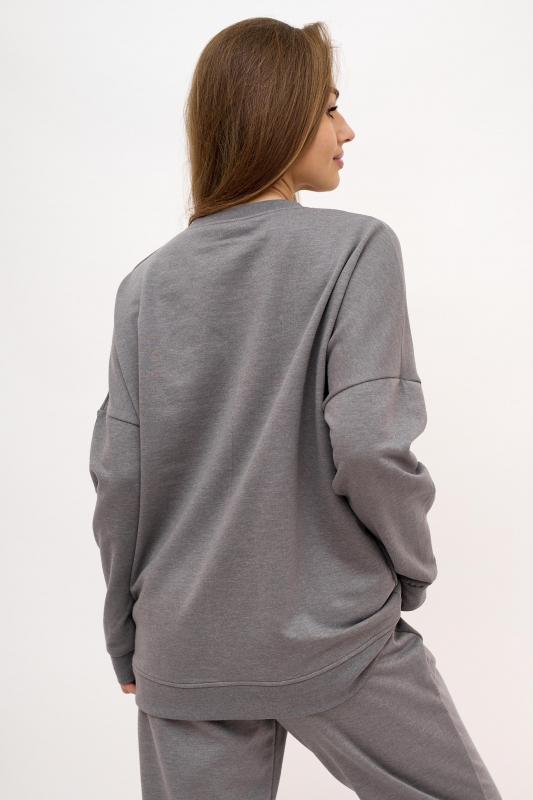 Стильная столствока с интересным дизаном. Модель свободного кроя со спущенной линией плеча. Рукав длинный с манжеткой. Горловой вырез круглый. По бокам толстовка небольшие разрезы.