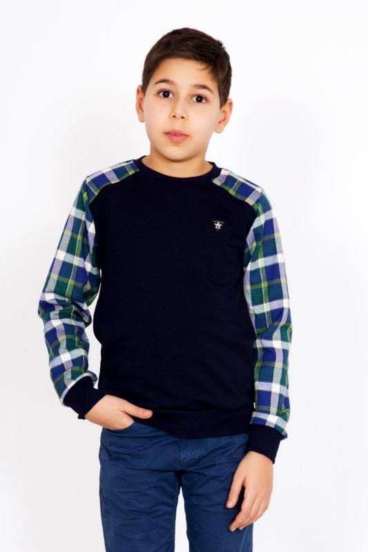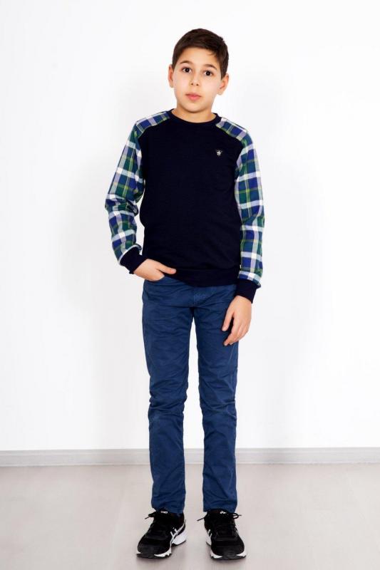 Стильная детская толстовка на мальчика. Толстовка свободного кроя с длинным рукавом. Удобную посадку изделия обеспечивает эластичная рибана на рукавах и по низу изделия. Горловой вырез – круглый. Дизайн толстовки выполнен интересным образом: полочка однотонного цвета, а спинка и рукава из ткани в клетку. В такой толстовке можно пойти как в школу, так и на прогулку.