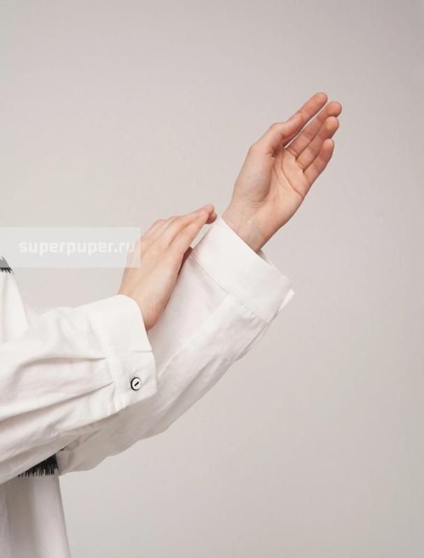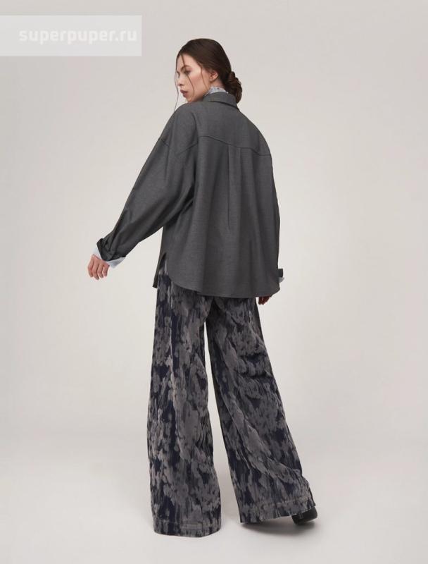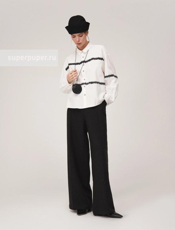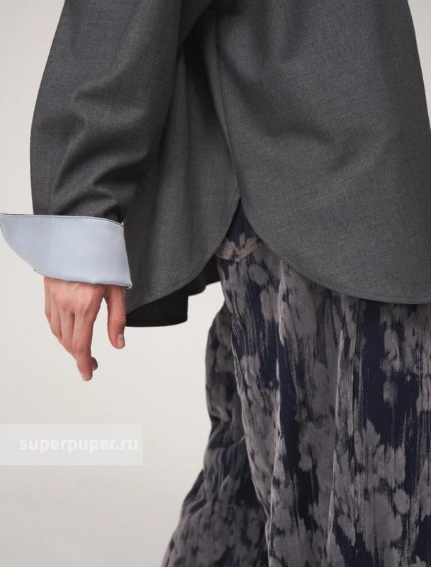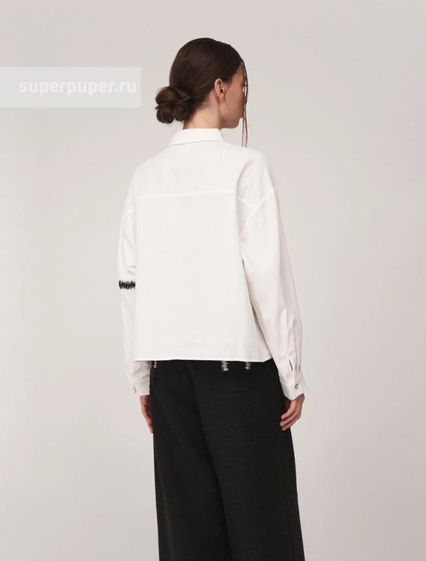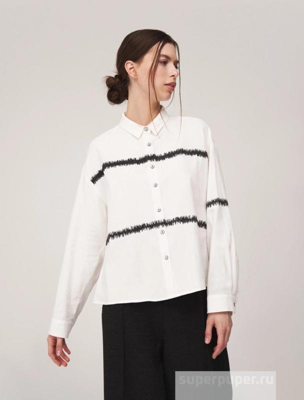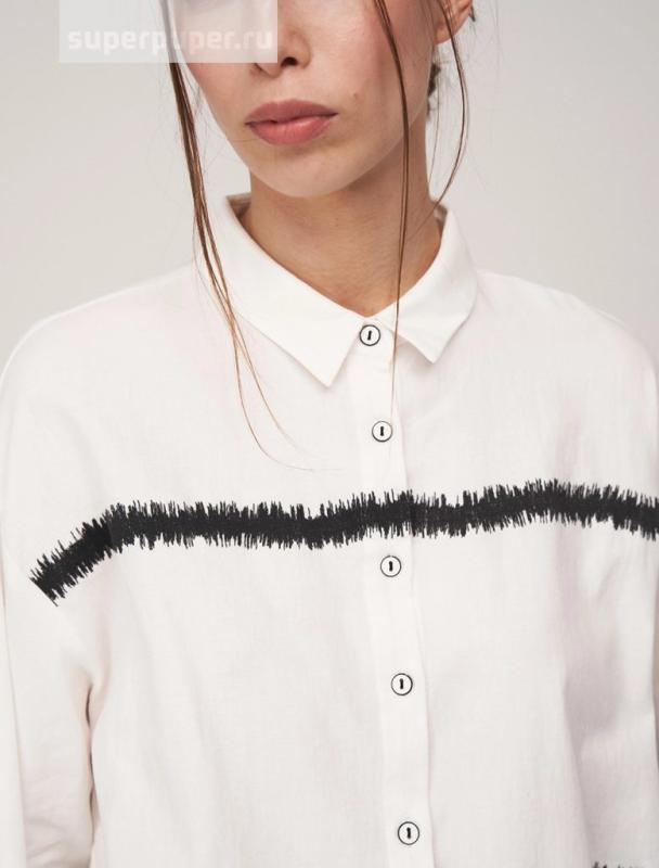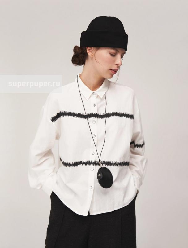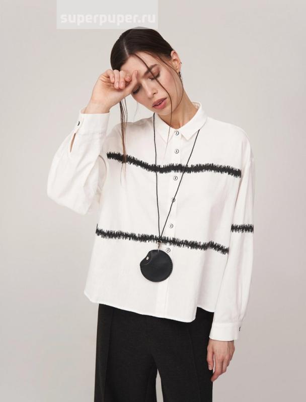 Видео: https-//hassfashion.ru/upload/iblock/303/blwv43sh8smt4bpy0d95157la3gz045a.mp4 осень-зима 98% Хлопок, 2% Полиэстер Рубашка регулярного силуэта со спущенной линией плеча. По горловине отложной воротник. По передней части изделия планка с застежкой на пуговицы и контрастный принт, переходящий на левый рукав. Выполнена из хлопка с небольшим добавлением полиэстера.