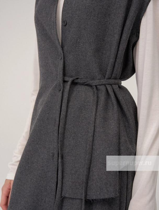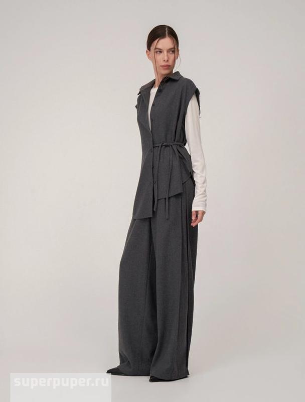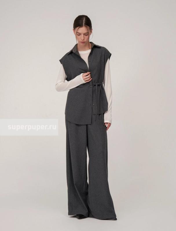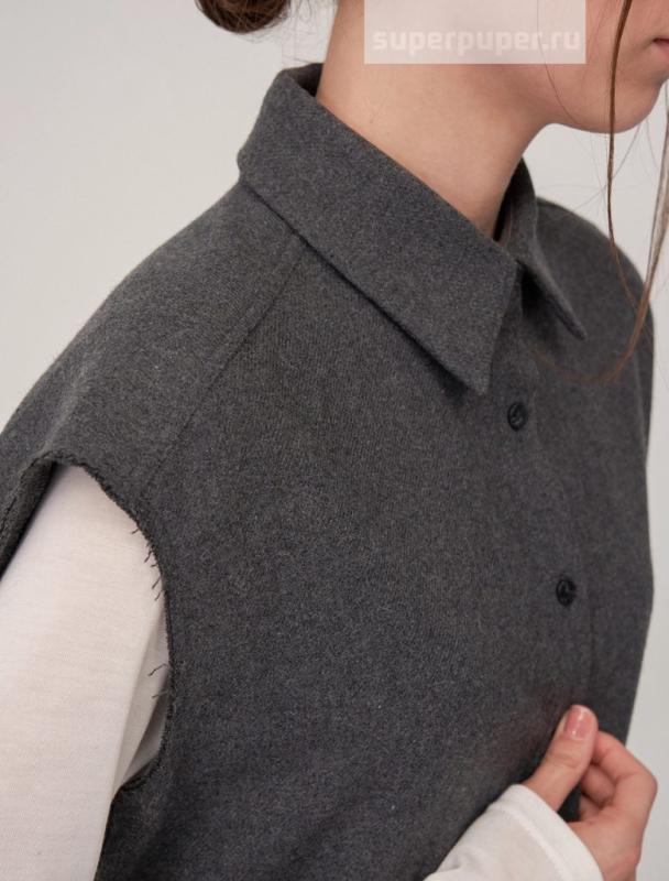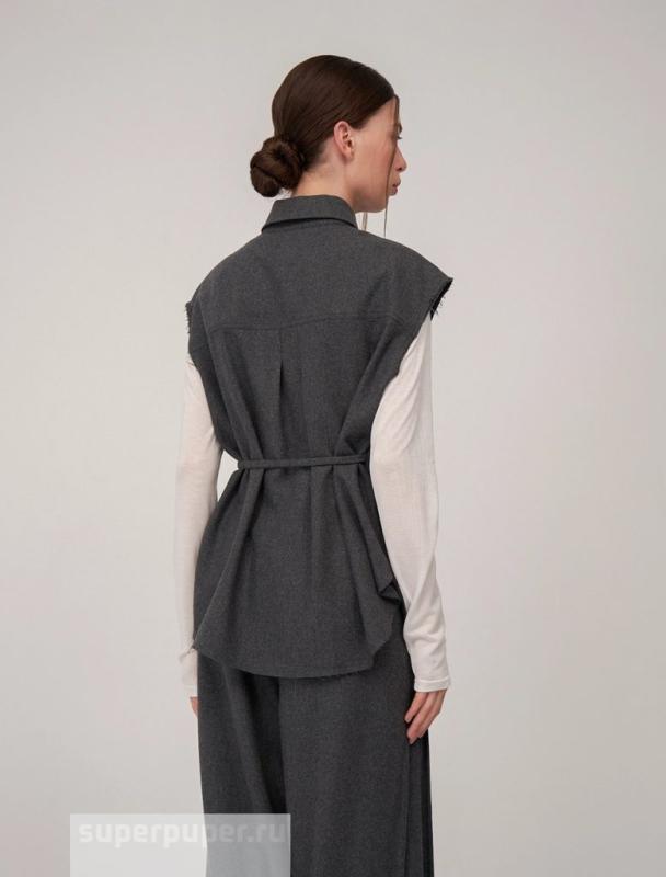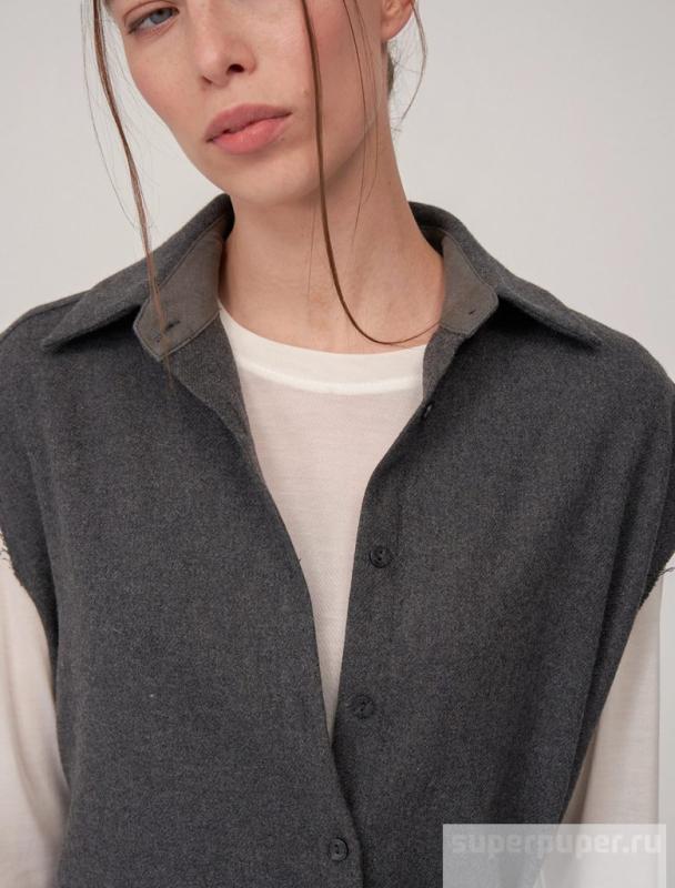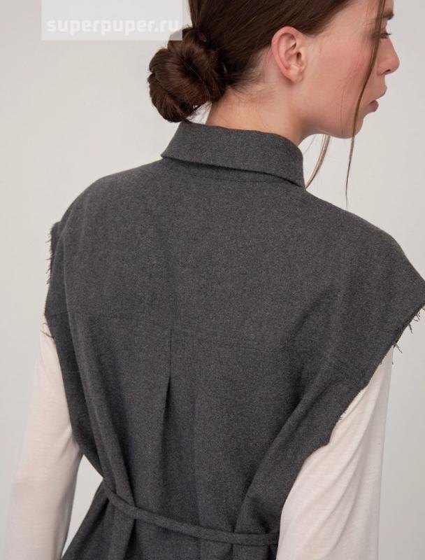 Видео: https-//hassfashion.ru/upload/iblock/65b/2dun6jf8dx0fx2ccu7wtim4xds7yhr6d.mp4 осень-зима 60% Шерсть, 20% Вискоза, 20% Полиэстер Рубашка прямого силуэта с отложным воротником, без рукавов. По передней части изделия — планка с застежкой на пуговицы. Слева, на уровне талии, из планки выходит шнурок из основной ткани. Сзади расположена кокетка и второй шнурок из основной ткани, который втачан в шов сбоку, с правой стороны. Низ рубашки асимметричный. Ткань верха выполнена из шерсти, вискозы и полиэстера, которые обеспечивают тепло, долговечность и комфорт.
