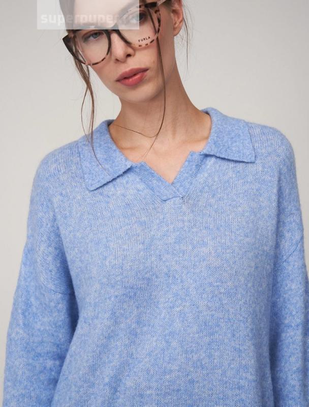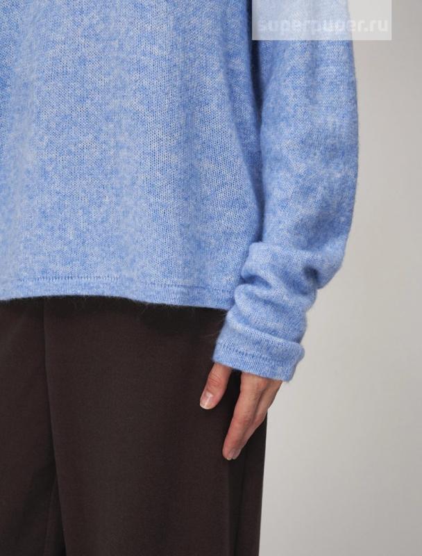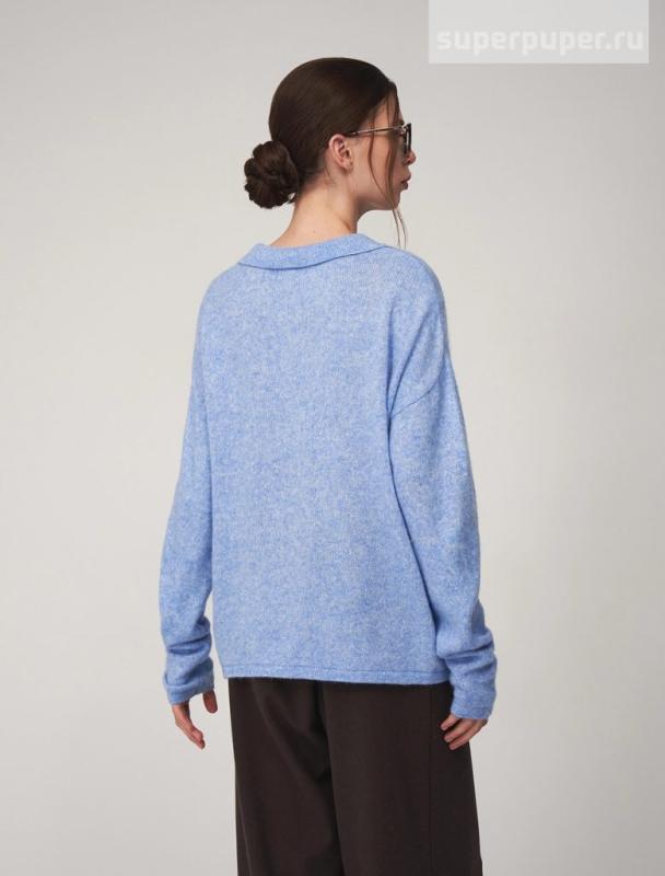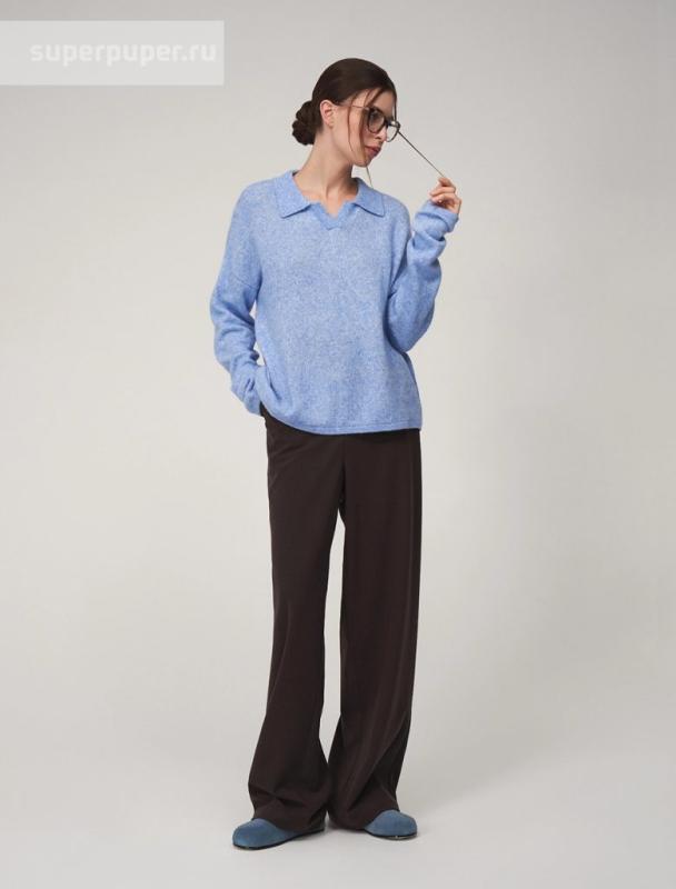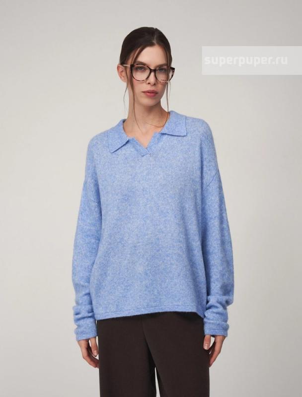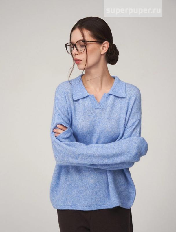 осень-зима 40% Шерсть, 30% Хлопок, 20% Полиэстер, 10% Махер Джемпер регулярного силуэта с воротником. Выполнен из мягкой, теплой, эластичной ткани в небесно-голубом меланже, в состав которой входит шерсть, хлопок, махер и полиэстер.