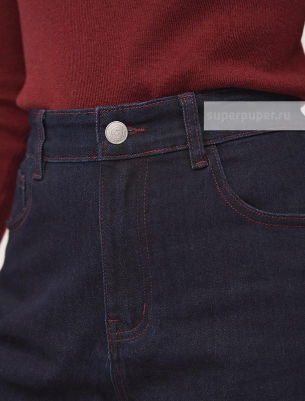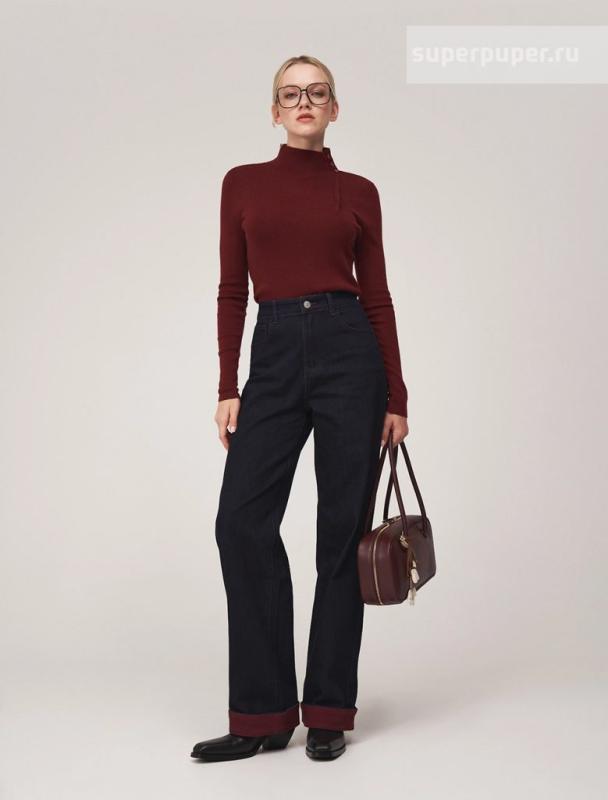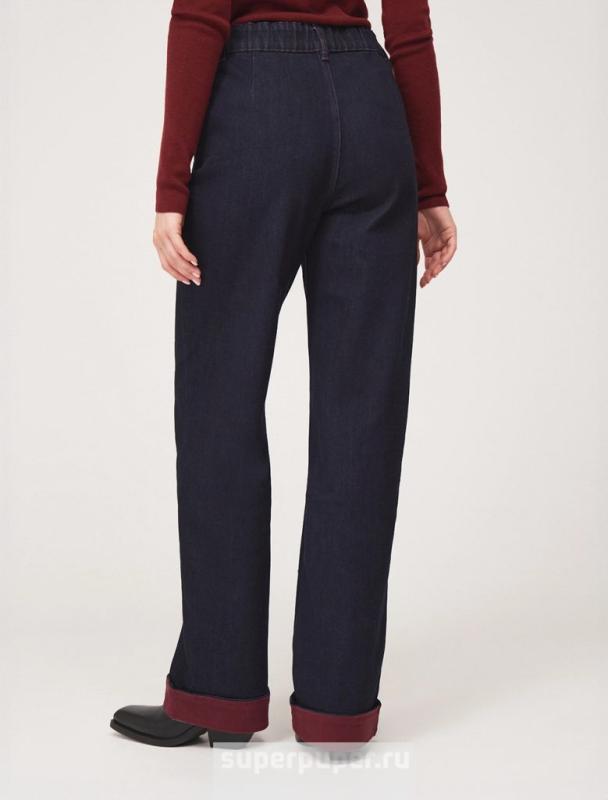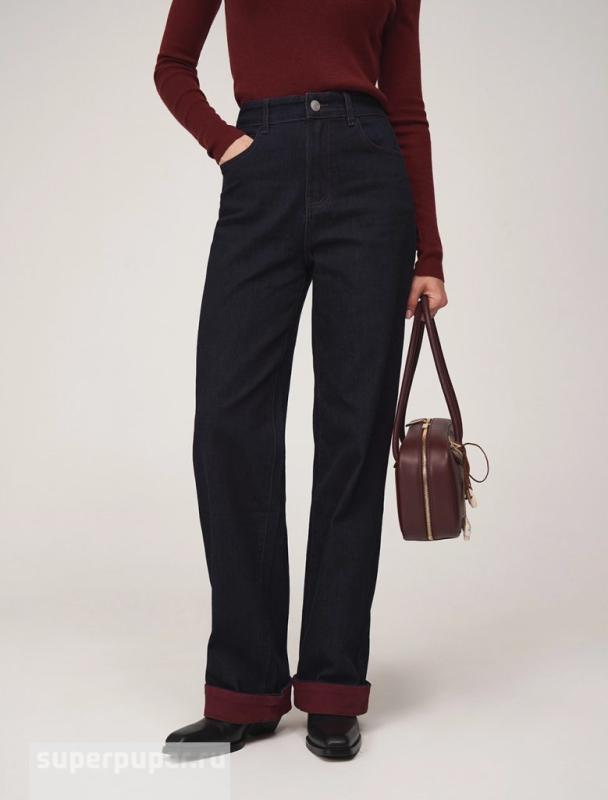 Видео: https-//hassfashion.ru/upload/iblock/172/86ykjrmhbtk6lqxuj9thayaxu2yowsxt.mp4 осень-зима 90% Хлопок, 10% Спандекс Джинсы прямого силуэта с посадкой на уровне талии. Спереди классический гульфик и застежка на молнию. По бокам врезные карманы. По поясу шлевки. Сзади кокетка и накладные карманы. Ткань верха из «сырого» денима. По низу подвороты в бордовом оттенке.