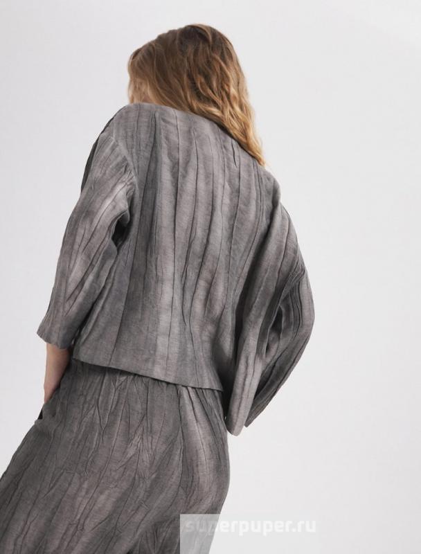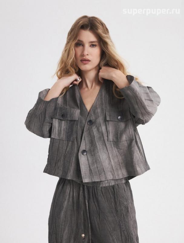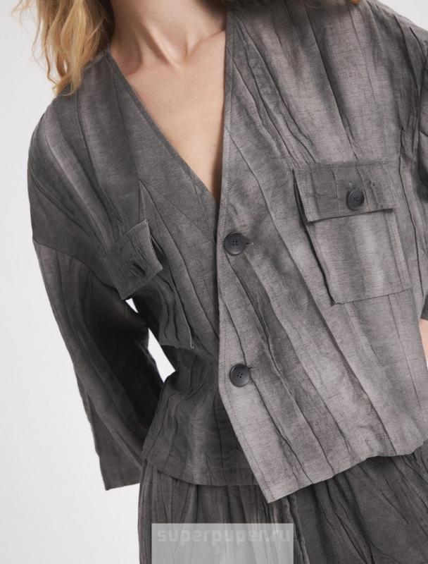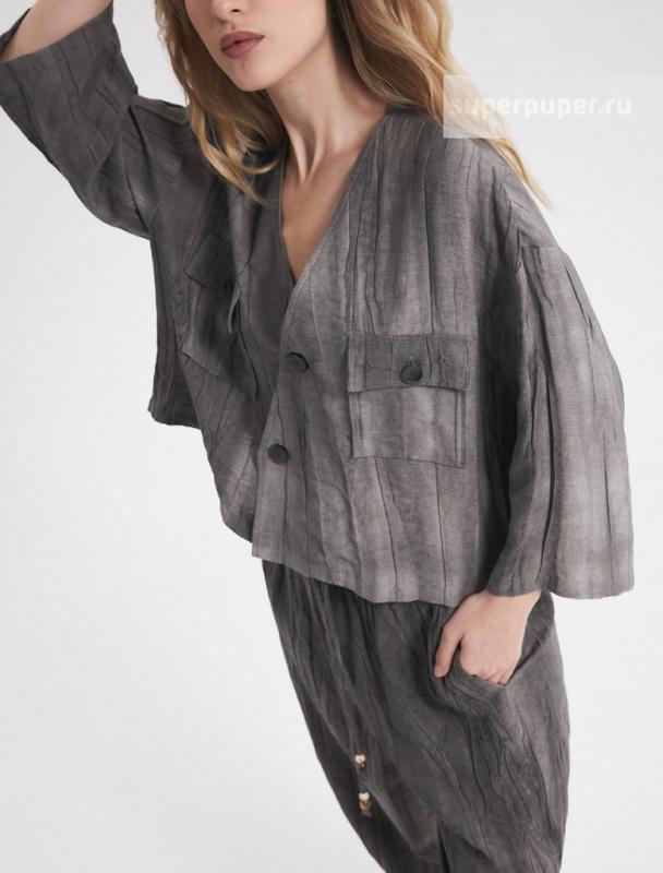 Видео: https-//hassfashion.ru/upload/iblock/d56/zzhrv039nw723xd61rdhx2f1wjafsl1m.mp4 весна-лето 60% Лен, 40% Тенсел Расслабленный жакет со спущенной линией плеча и рукавами 3/4. По передней части изделия асимметричная застежка на пуговицы и нагрудные карманы с клапанами. Изделия выполнено из льна и тенселя.