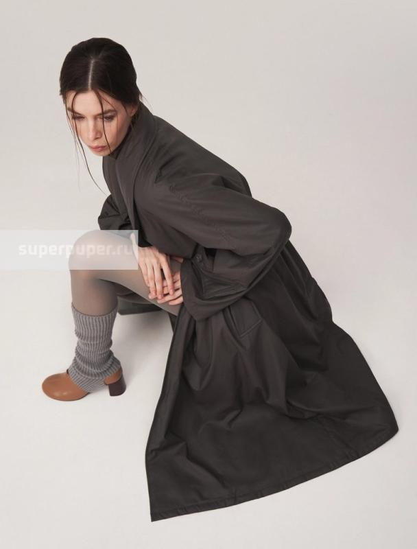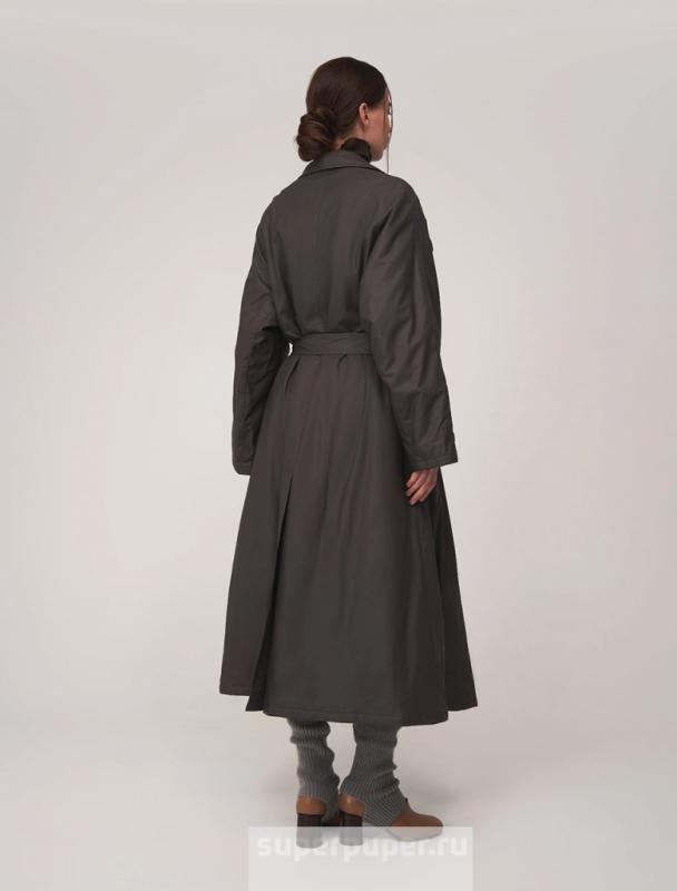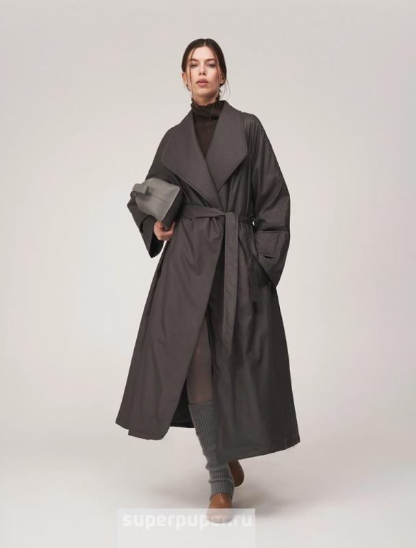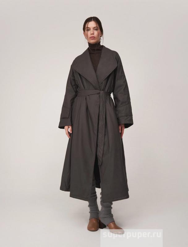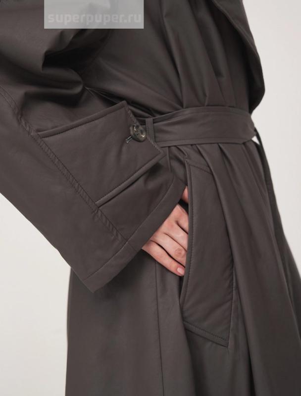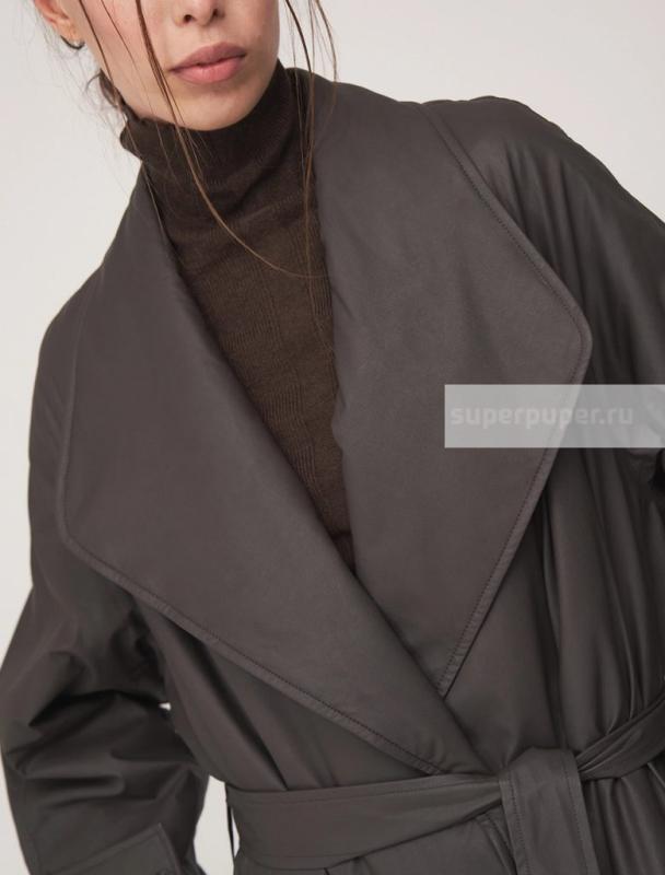 C: 100% Полиэстер Плащ свободного силуэта с рукавами по типу реглан. По передней части изделия широкий шалевый воротник. По бокам — карманы. Сзади, по низу высокая шлица. По низу рукавов широкие хлястики на пуговицах. На талии шлевки и пояс для приталивания. Внешняя часть изделия выполнена из экокожи, а утеплитель из биопуха, что обеспечивает износостойкость и тепло.